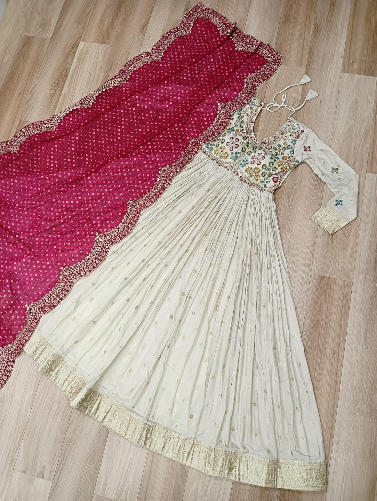 - Fabric & Design: Complementing the gown is a beautiful Georgette dupatta with traditional Bandhani print—a timeless Indian print style. The dupatta also features embroidered cut-work edges, adding finesse and detailing that elevate the entire ensemble.