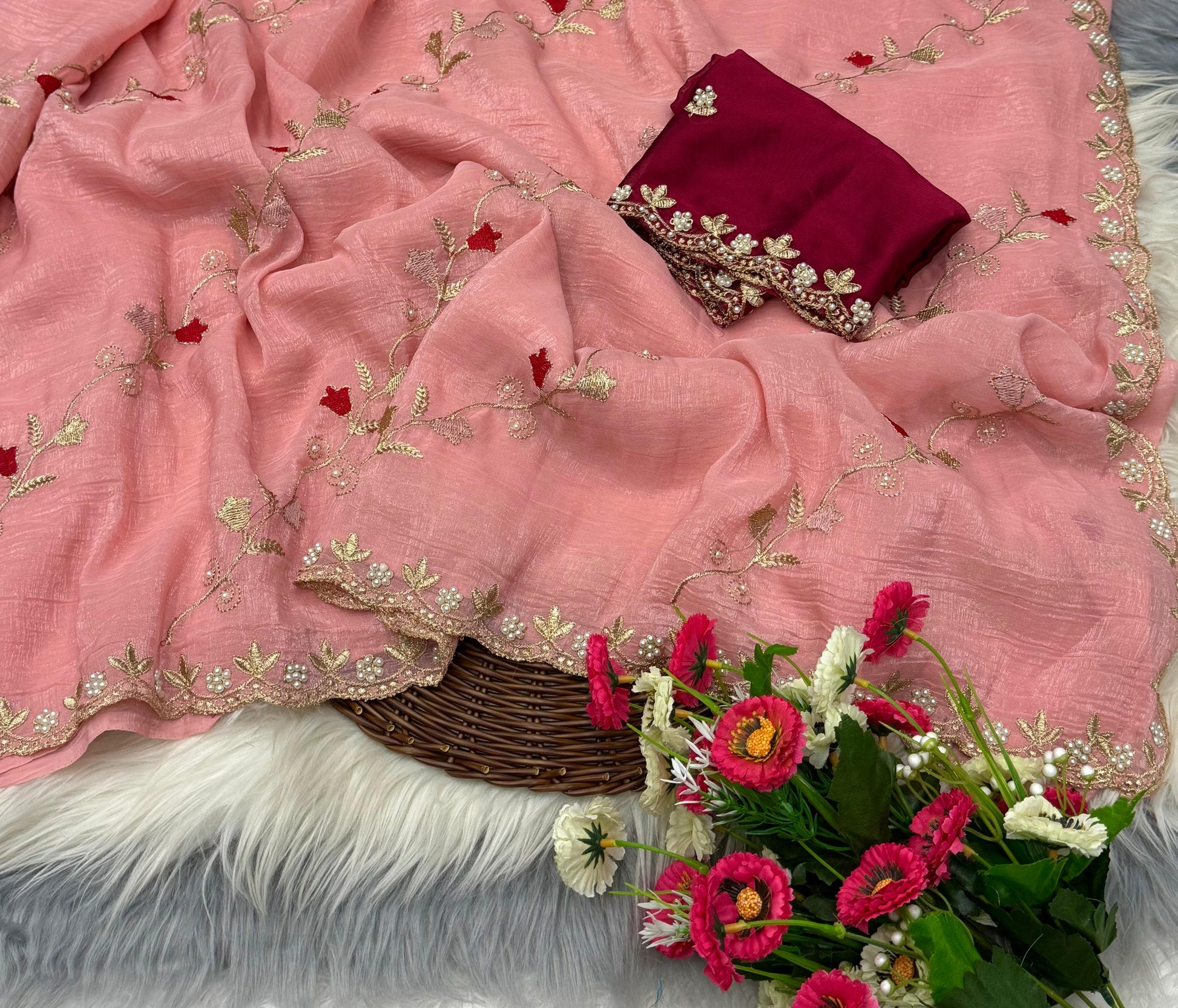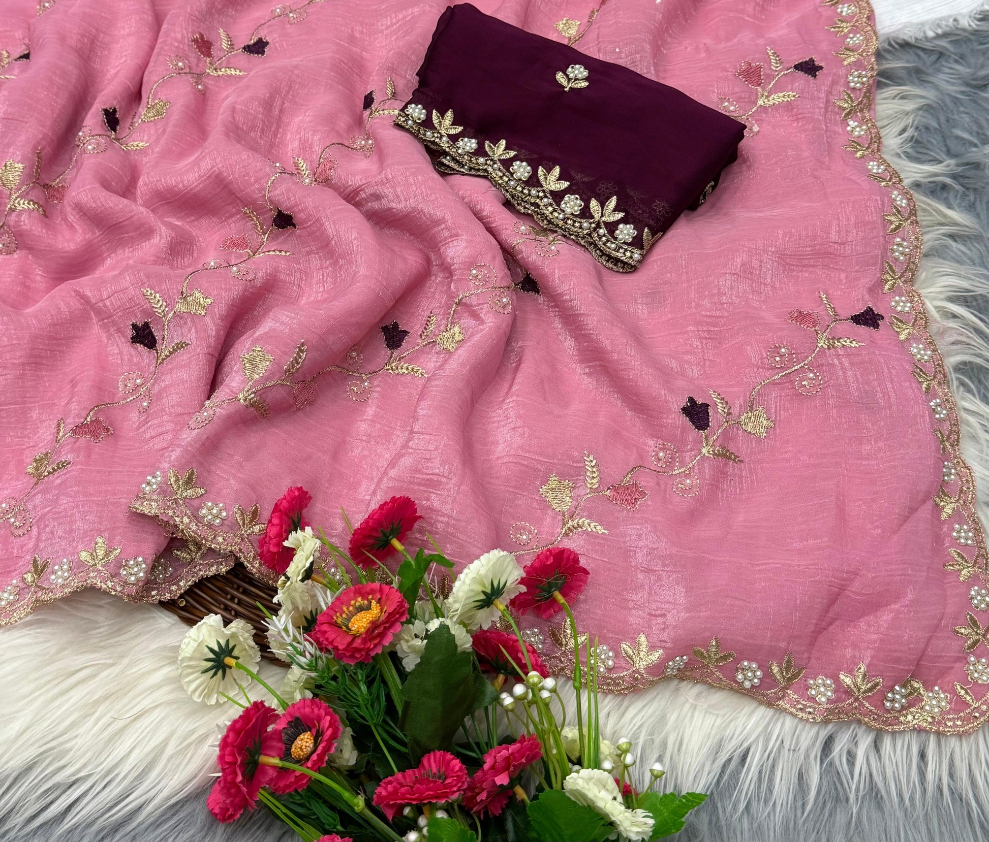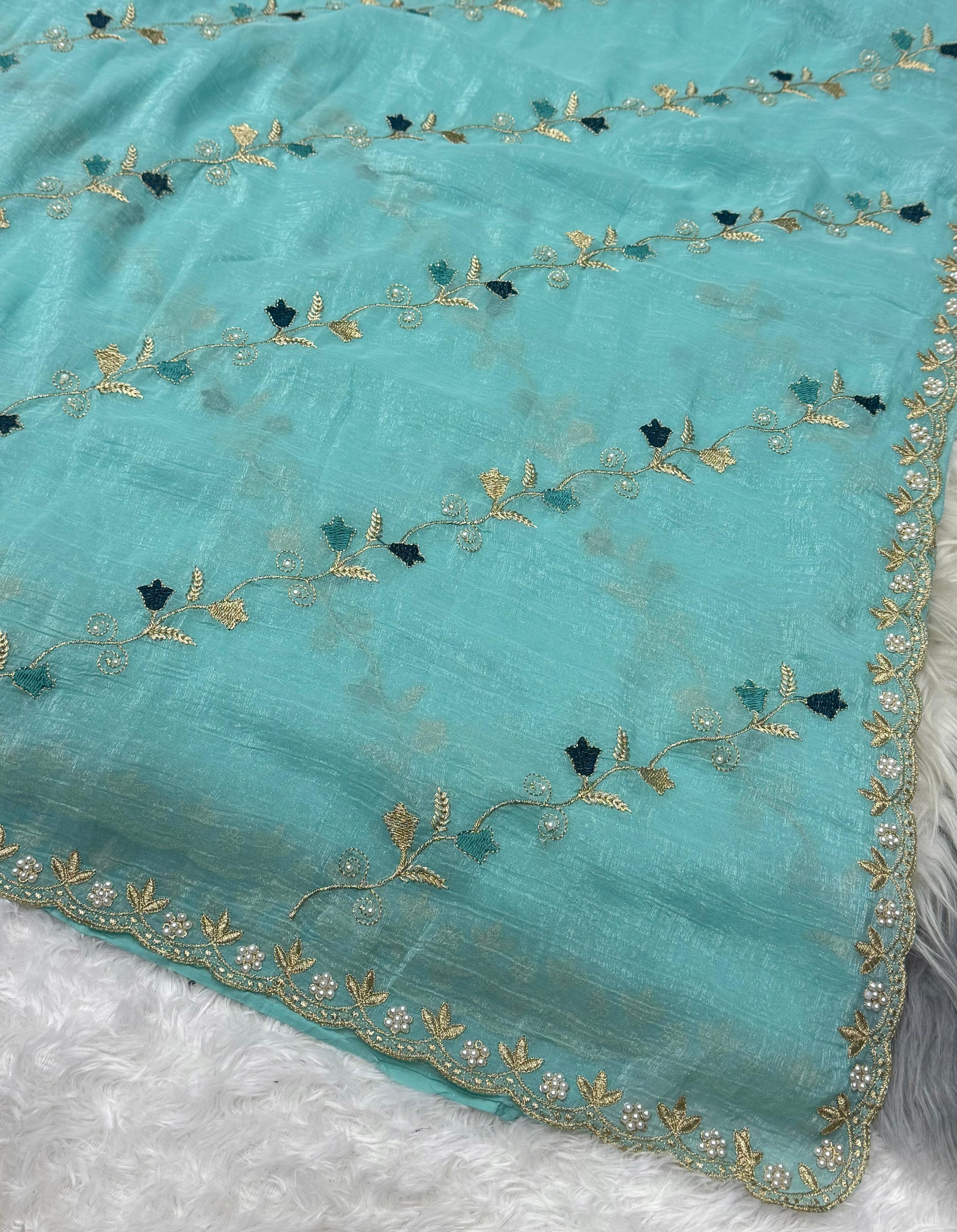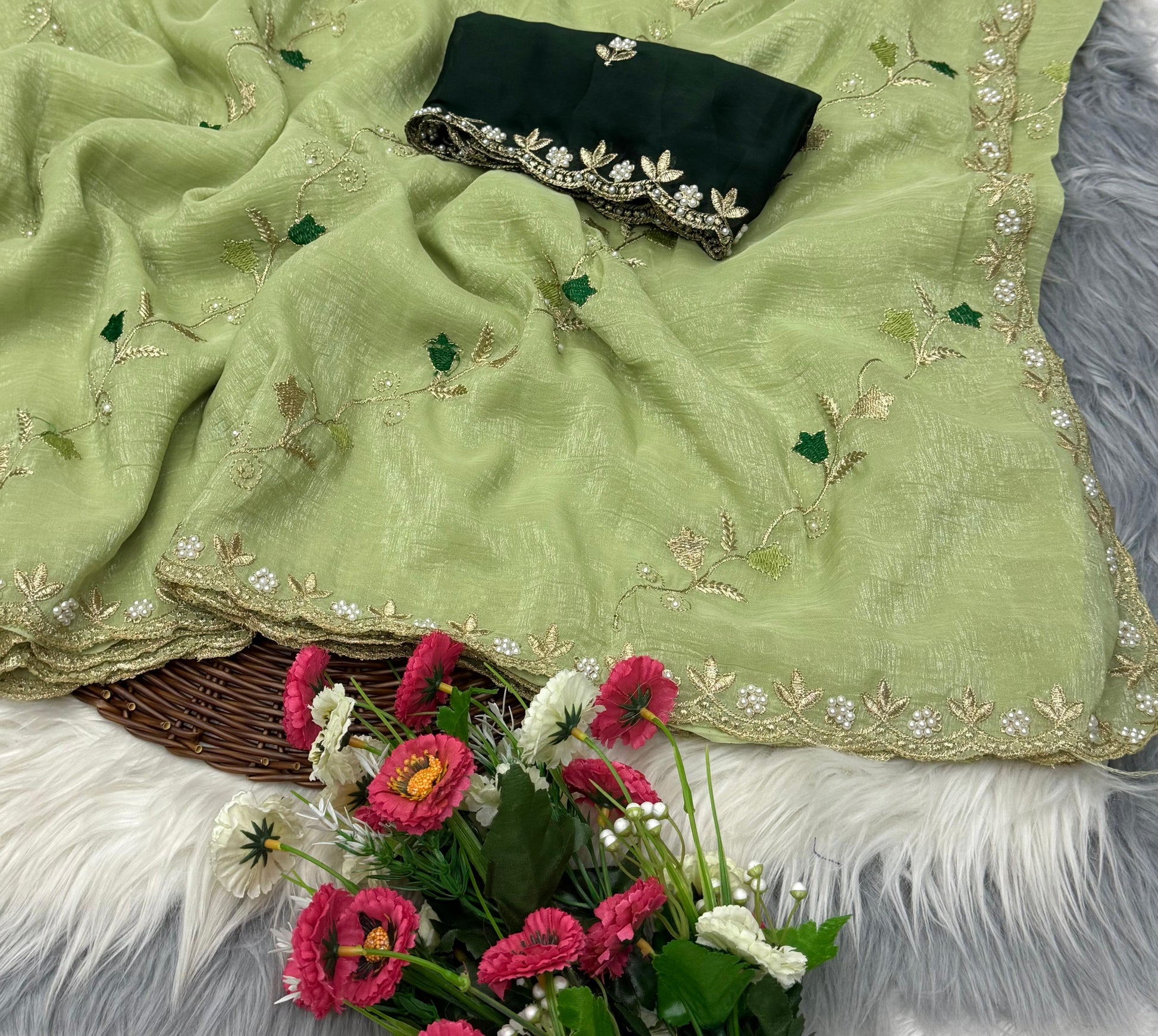 Crunchy Silk with beautiful C-pallu and Amazing lehariya work allover saree with moti work scalloped cut work border and in lehariya pattern.