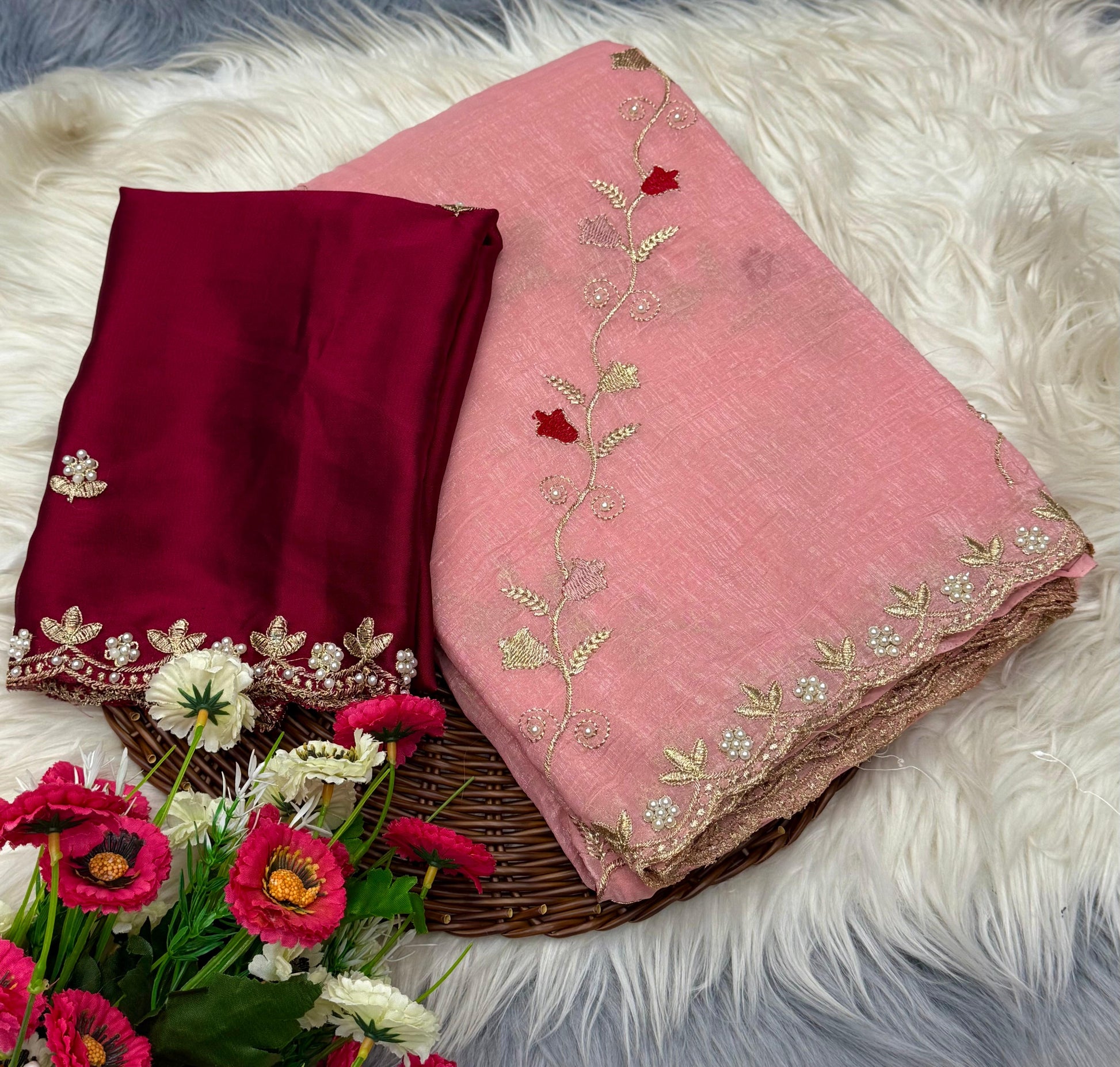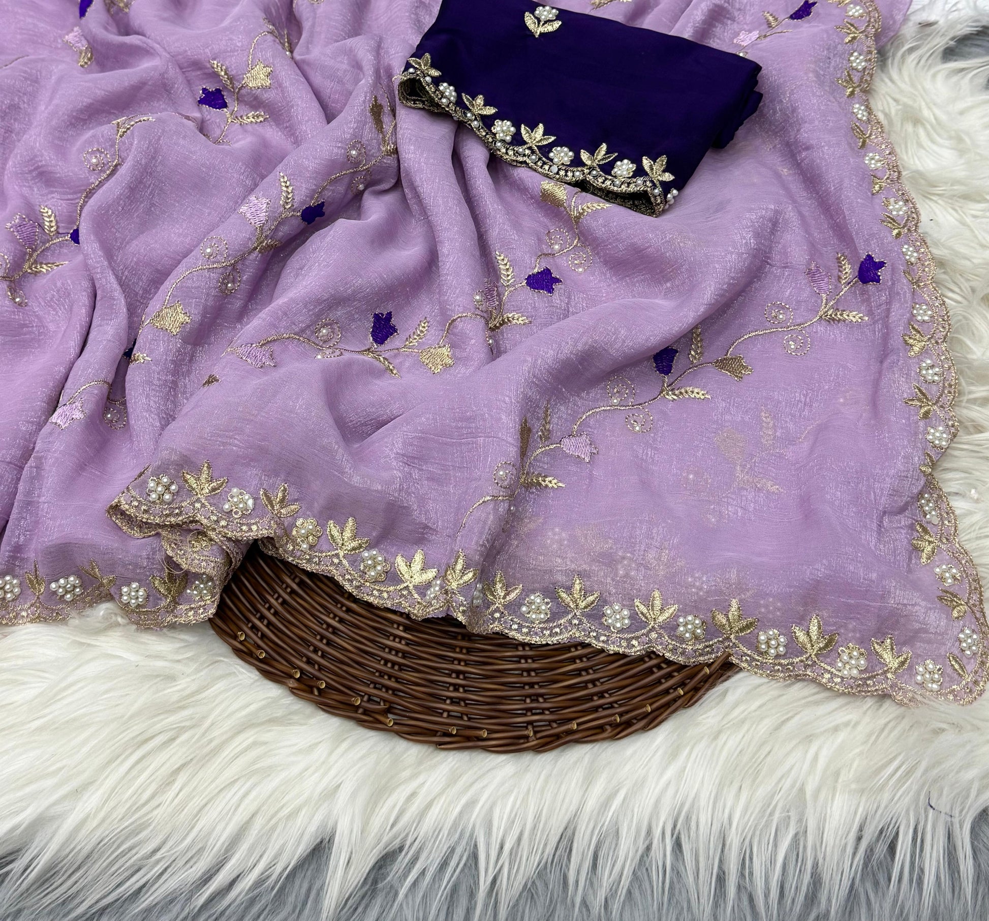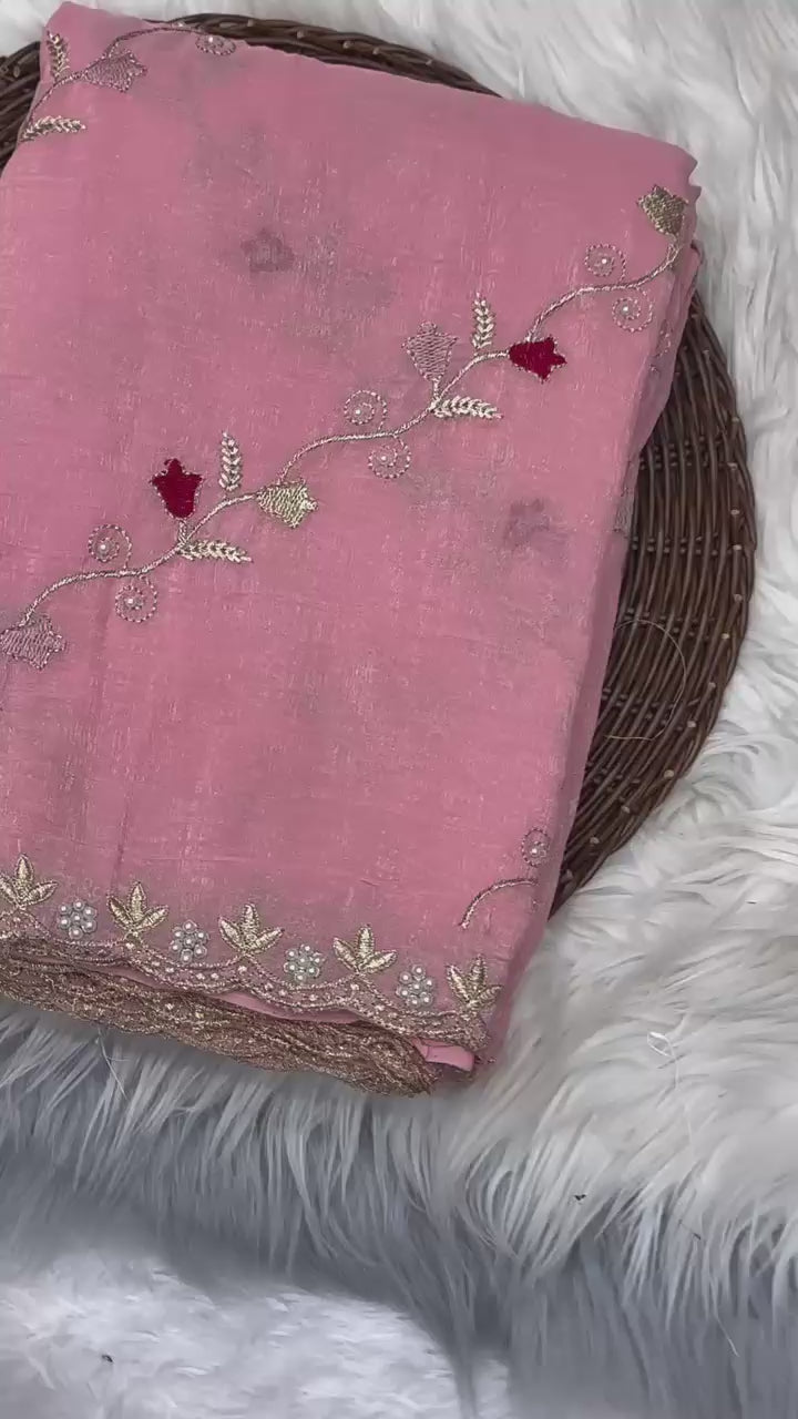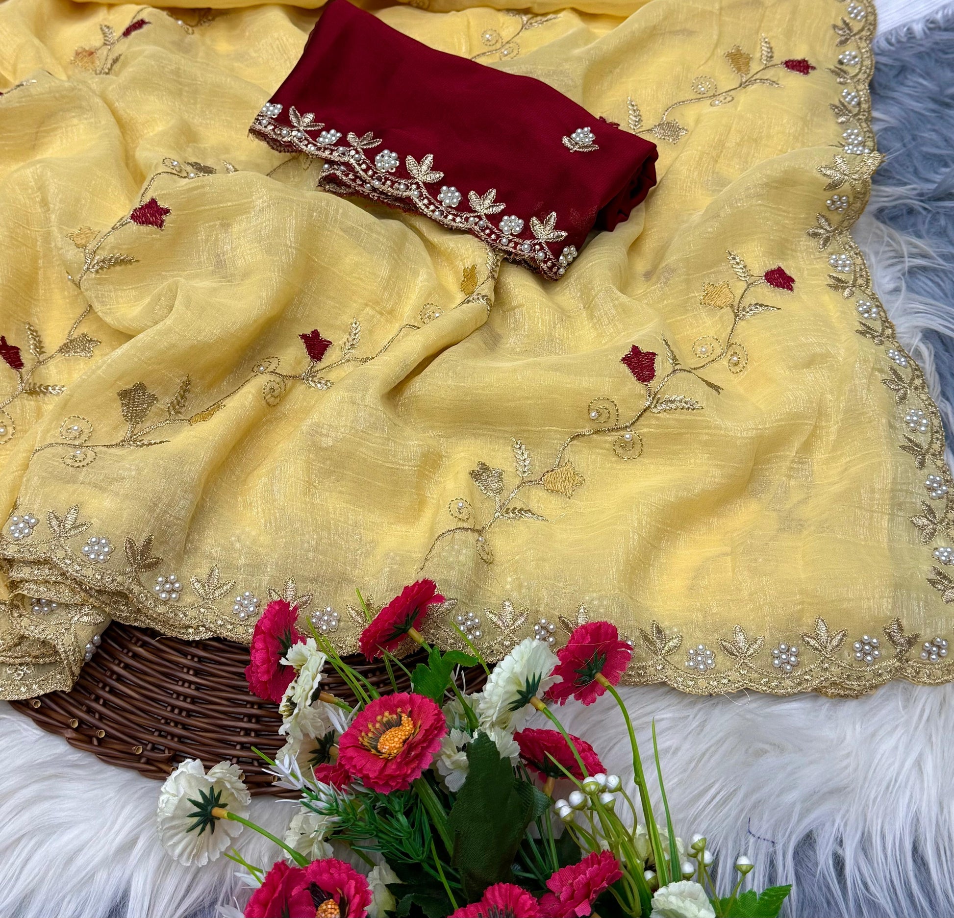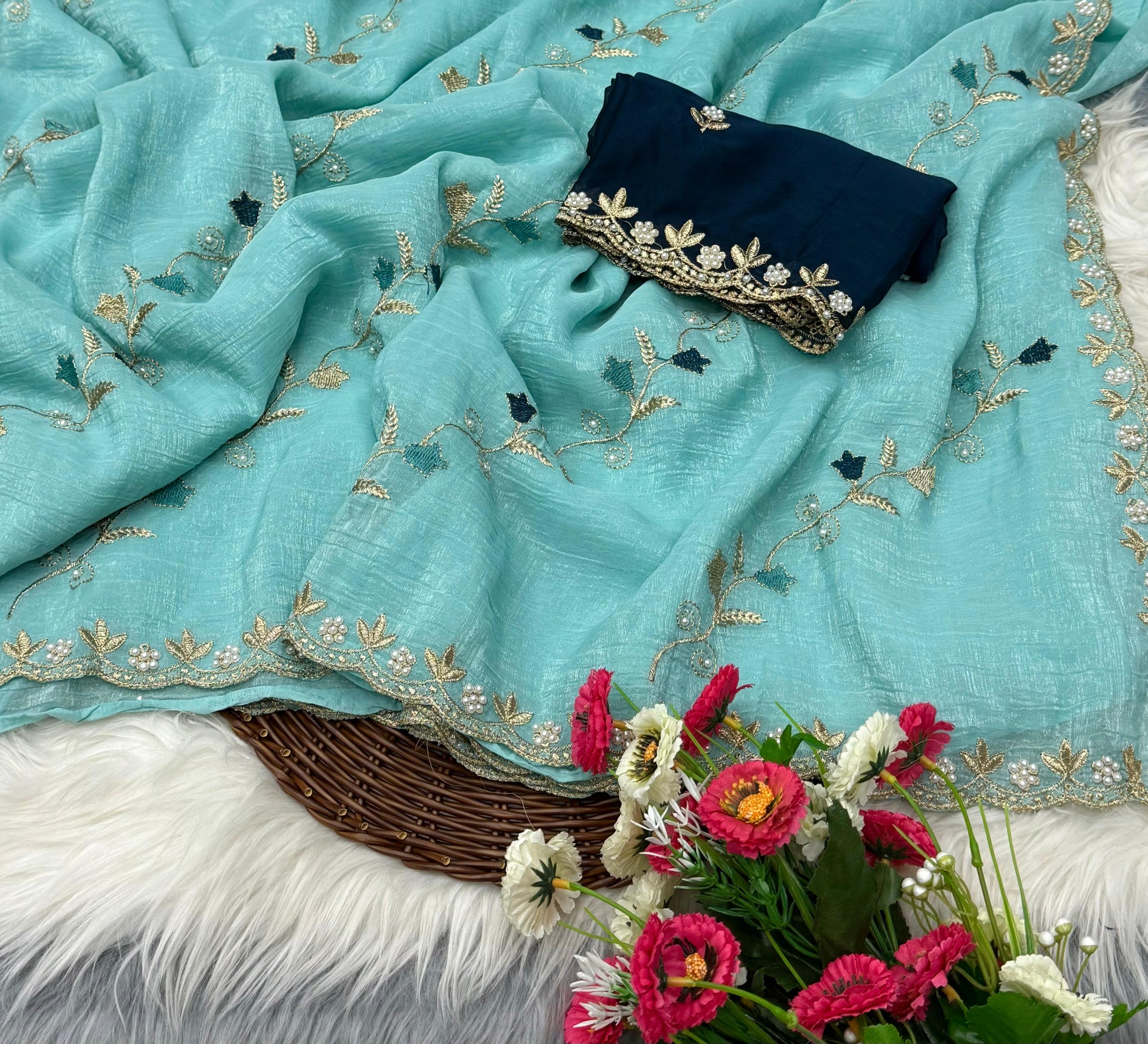 Crunchy Silk with beautiful C-pallu and Amazing lehariya work allover saree with moti work scalloped cut work border and in lehariya pattern.
