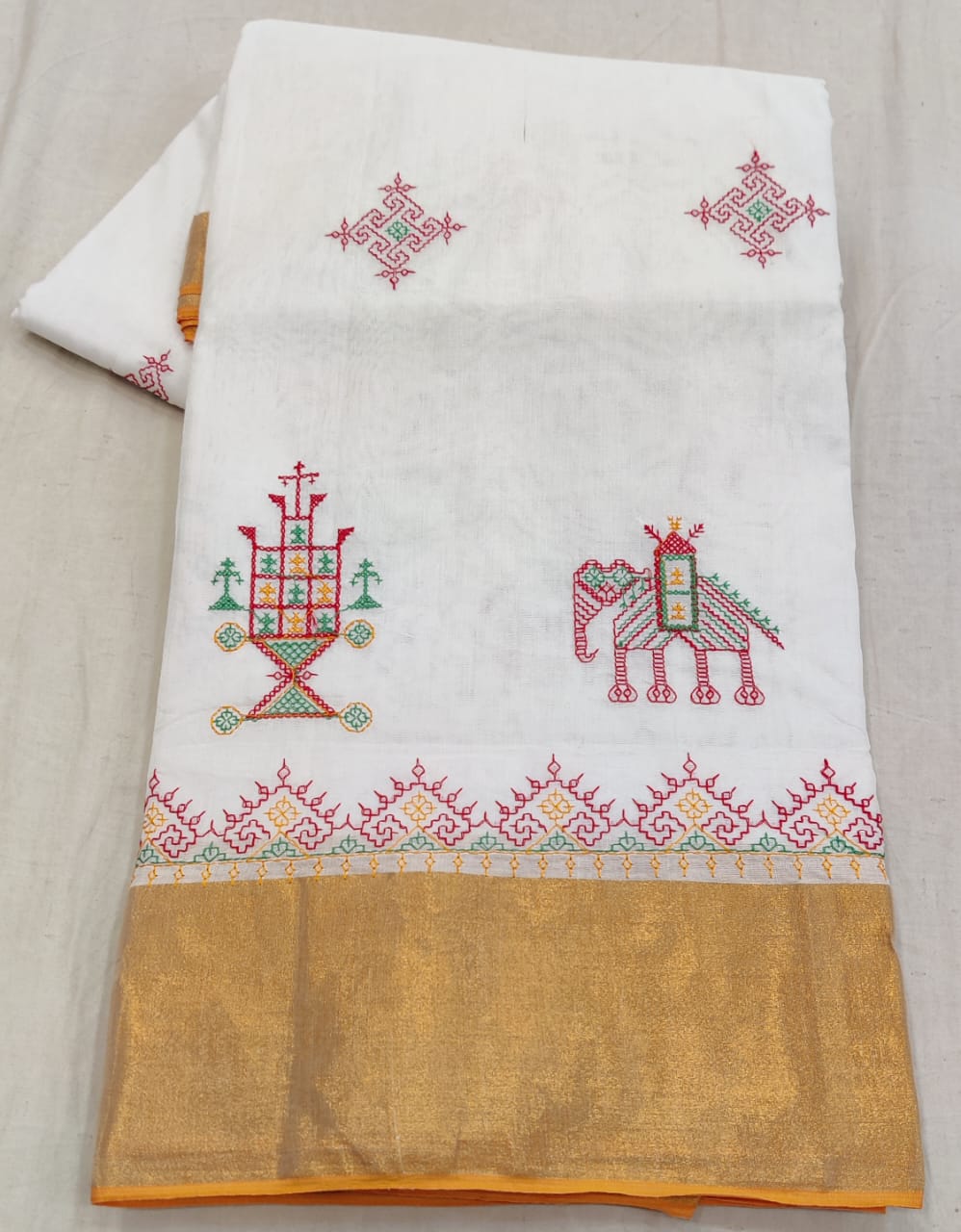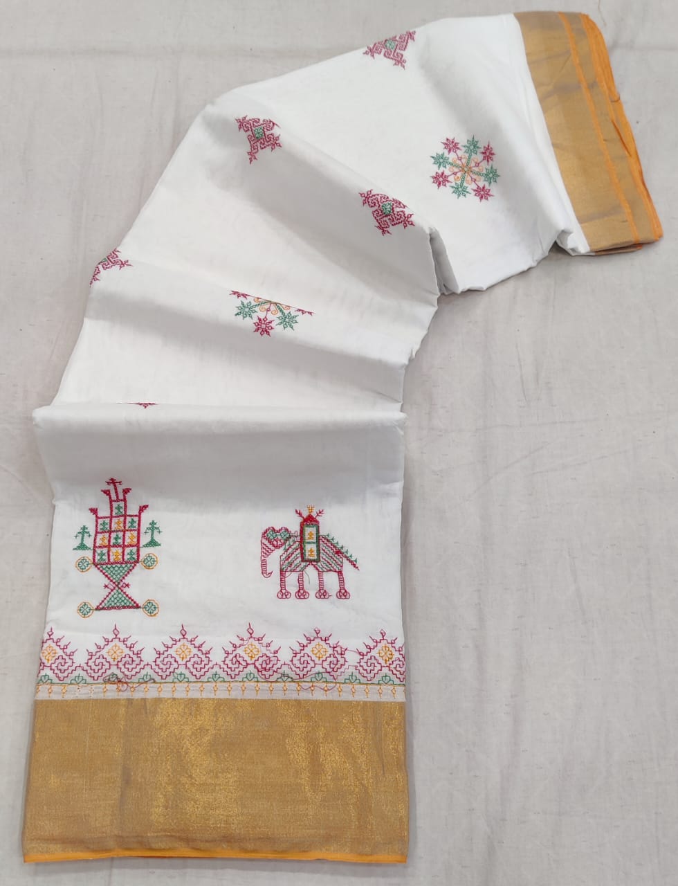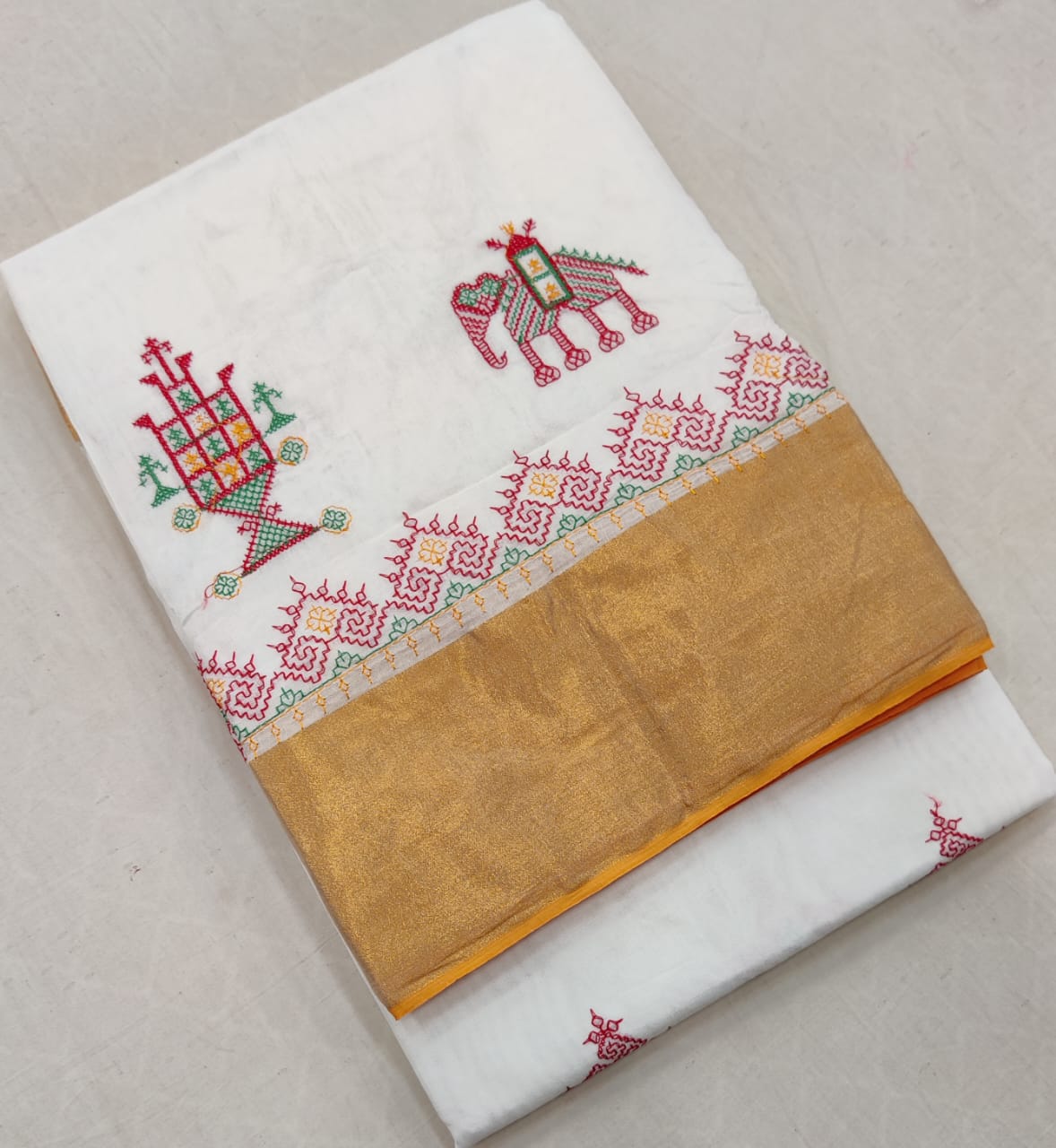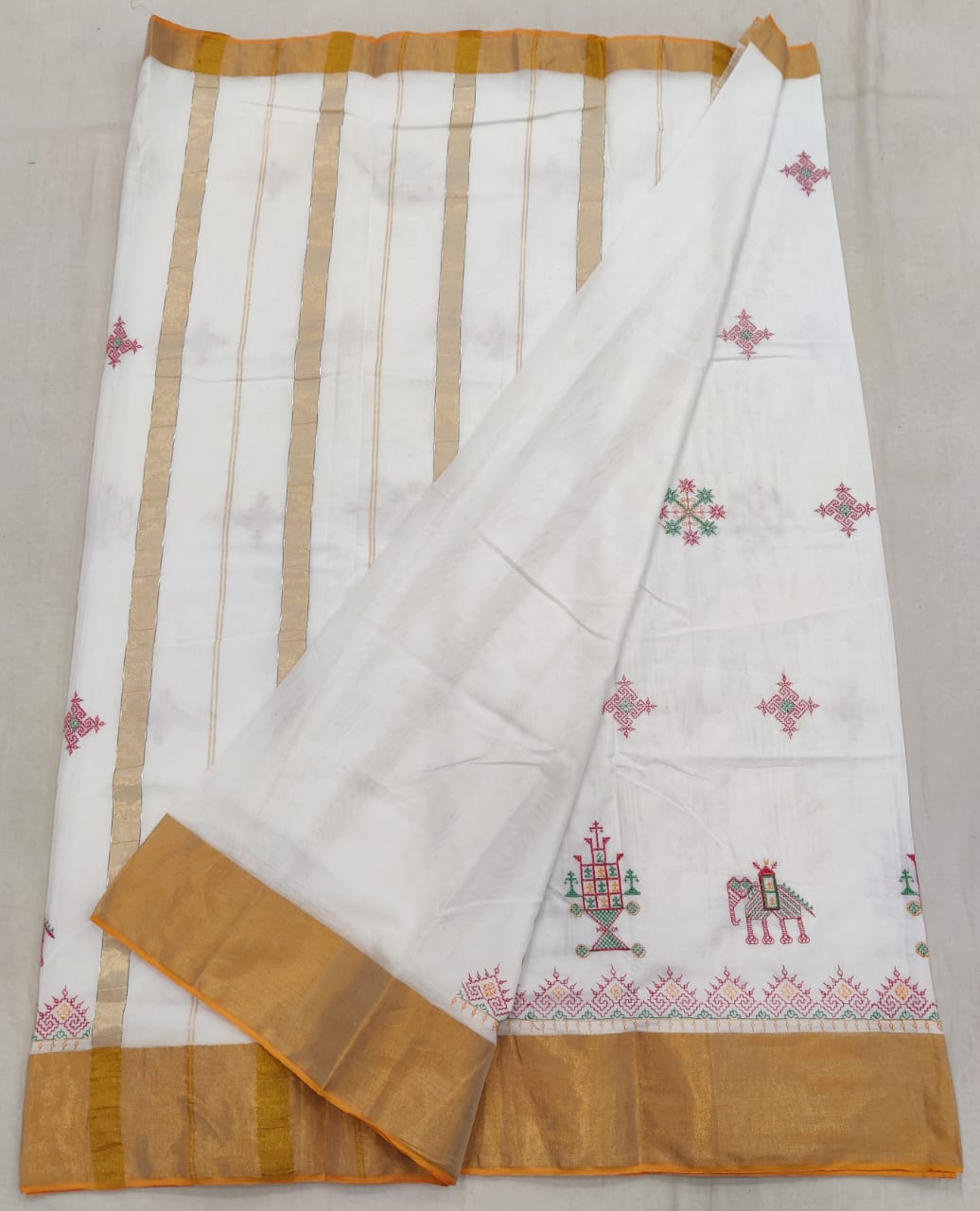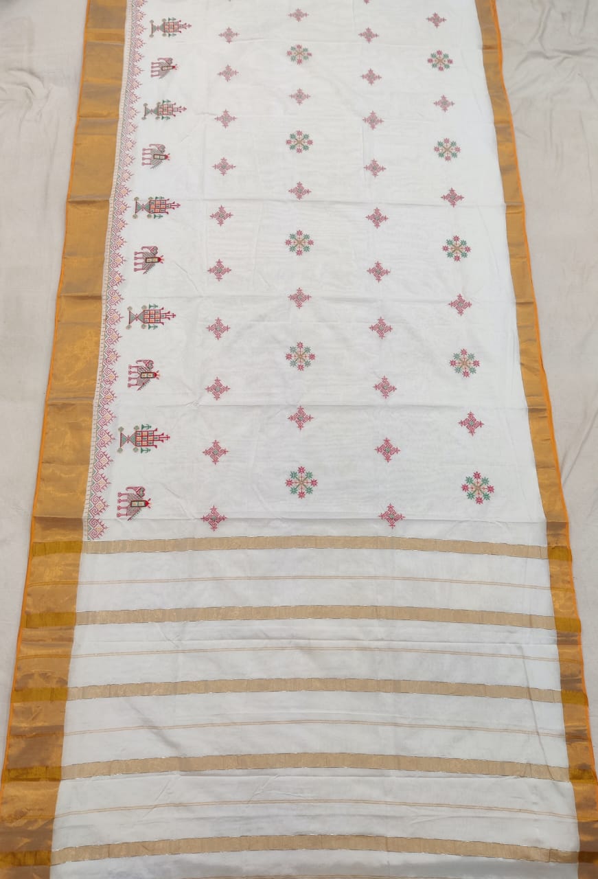 - 1 White Cotton Saree with Golden Zari Border & Kasturi Work