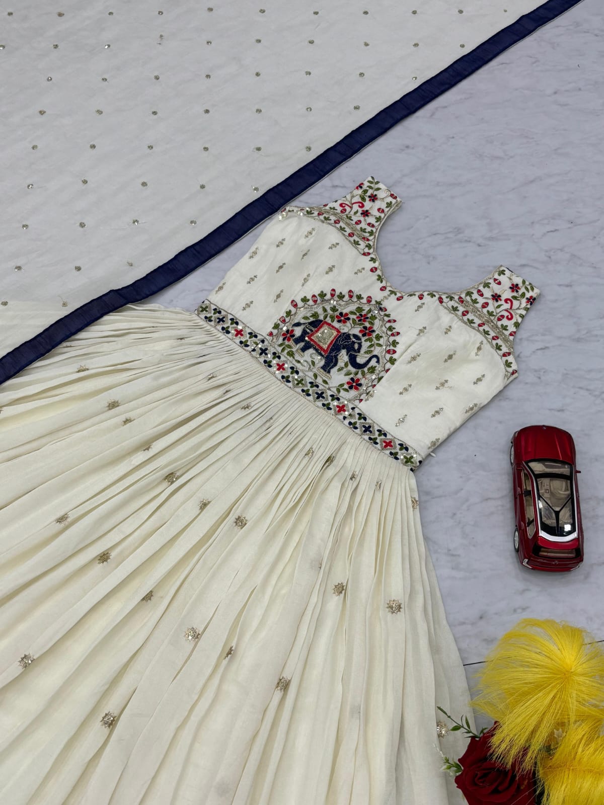 Step into timeless elegance with our luxurious Chinon embroidered gown, a perfect blend of traditional charm and contemporary grace. Designed to make you the center of attention at any occasion, this masterpiece radiates sophistication with every swirl.