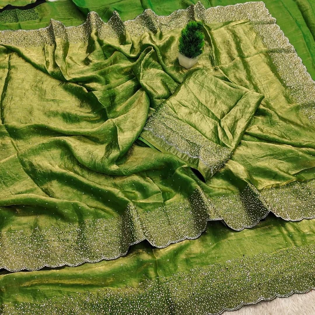 Adorned with fine Jarkan embroidery work, the saree reflects skilled artistry. The detailing adds a touch of shimmer and festive elegance, making it perfect for grand occasions.