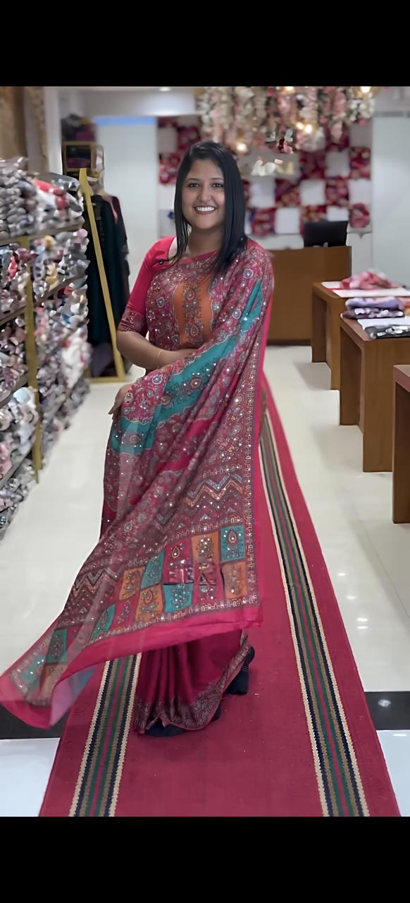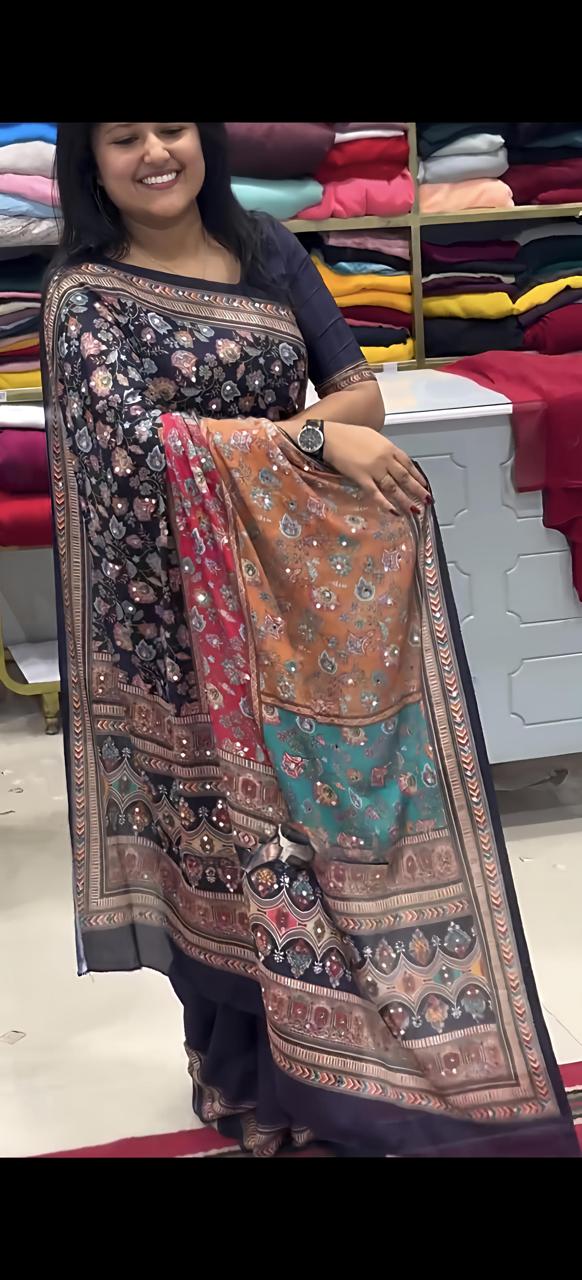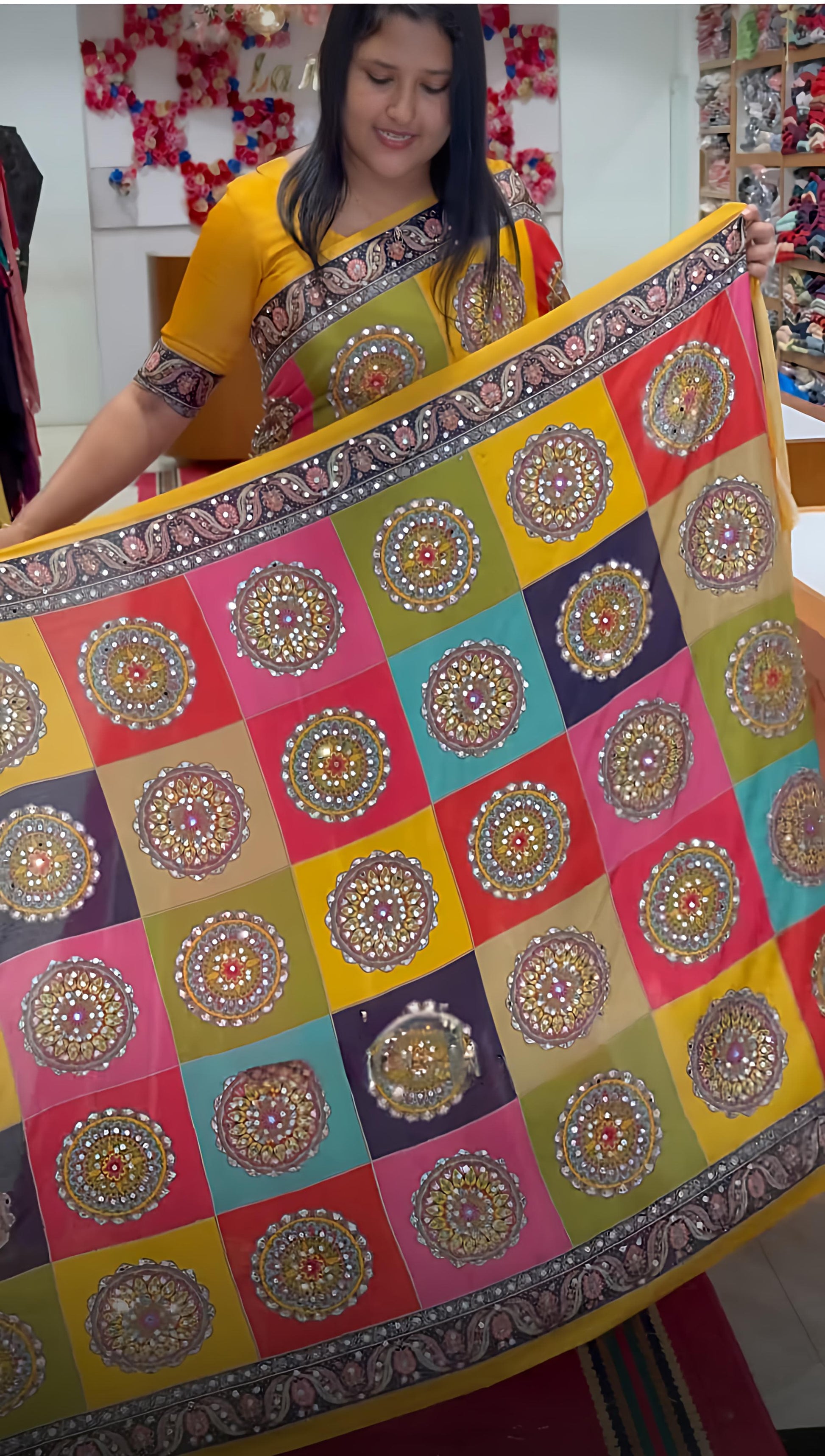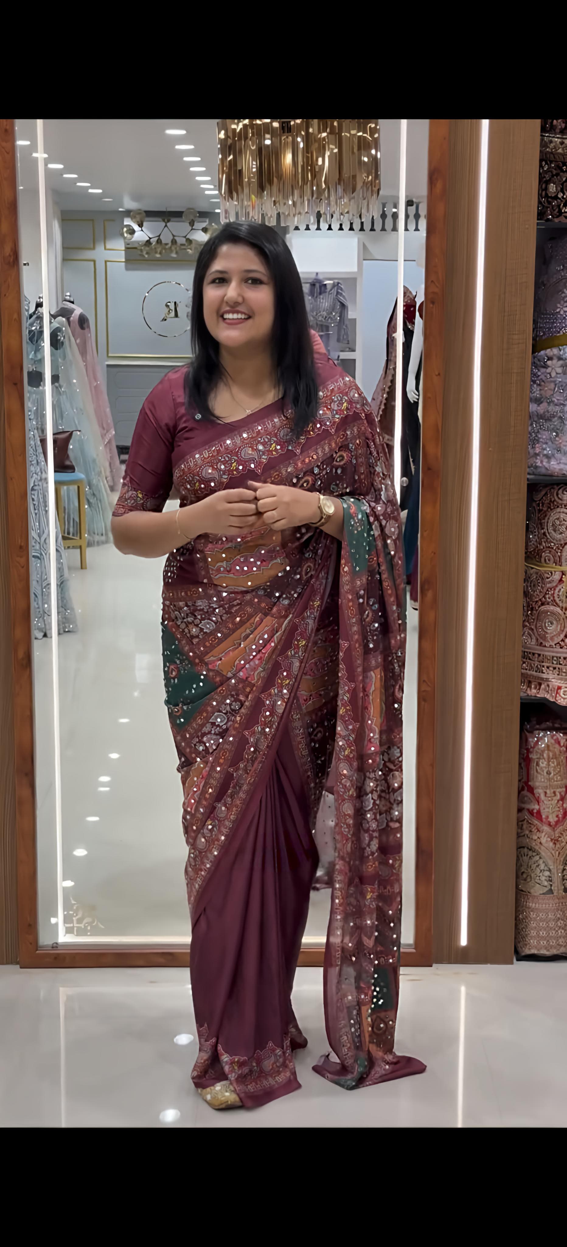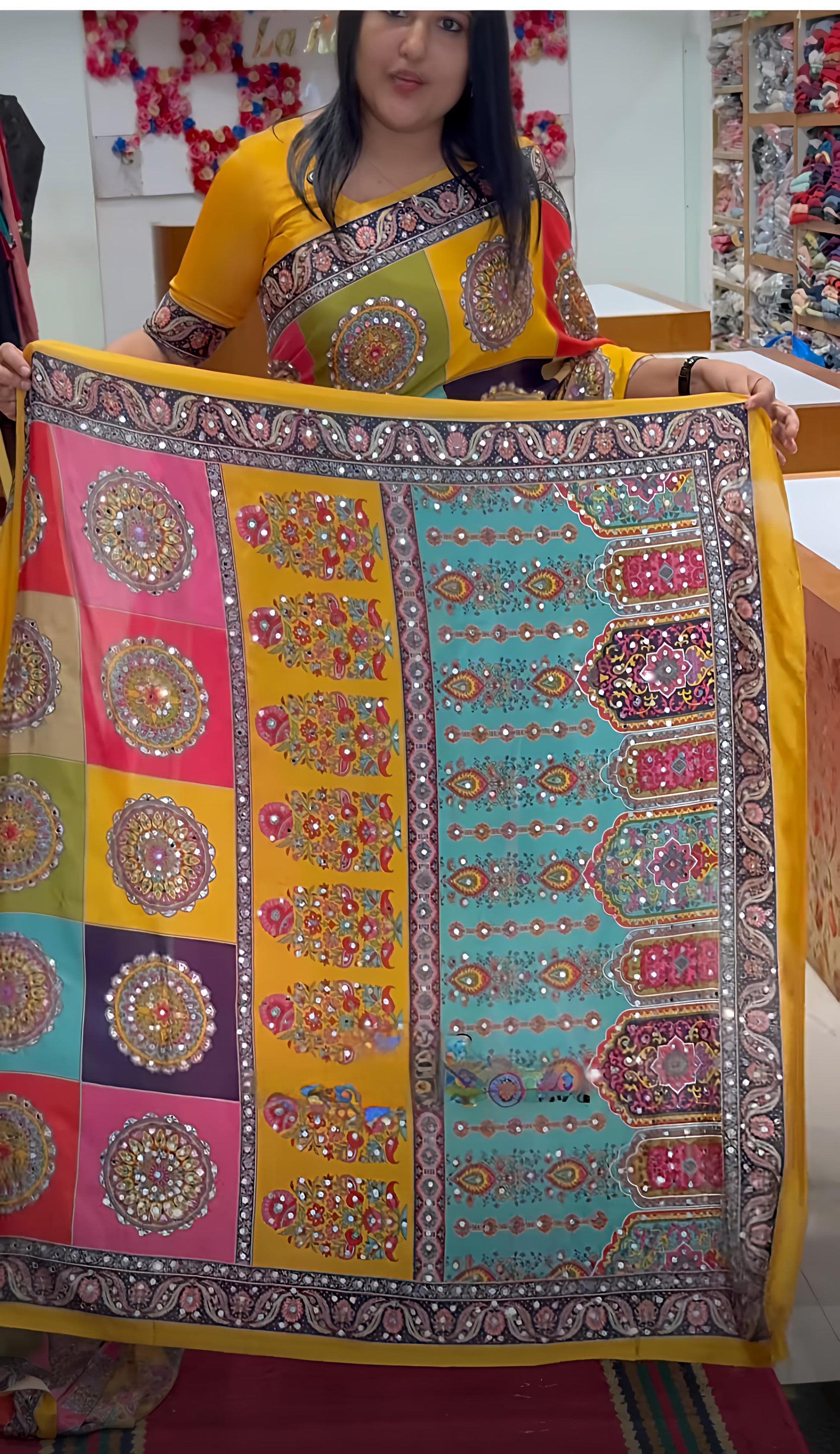 Heavy chinon saree with digital print and mirror work all over saree attached with perfectly matched pallu & blouse piece