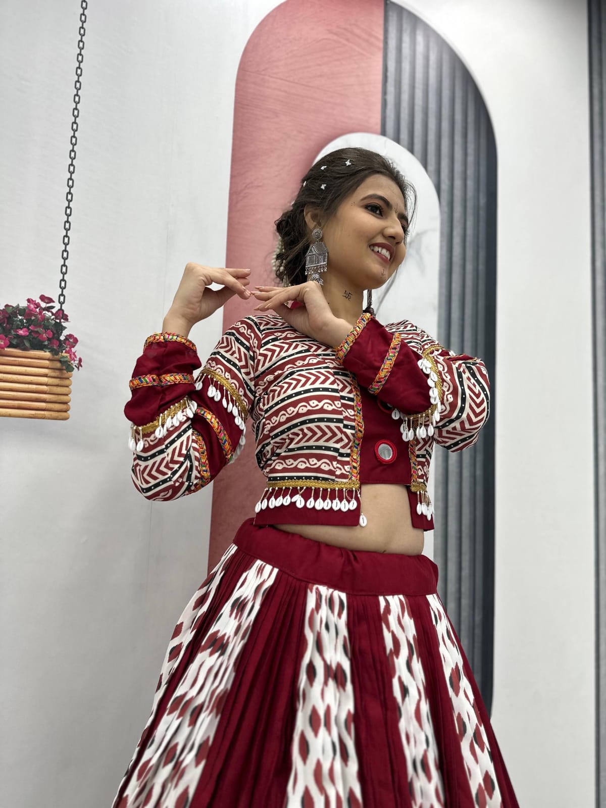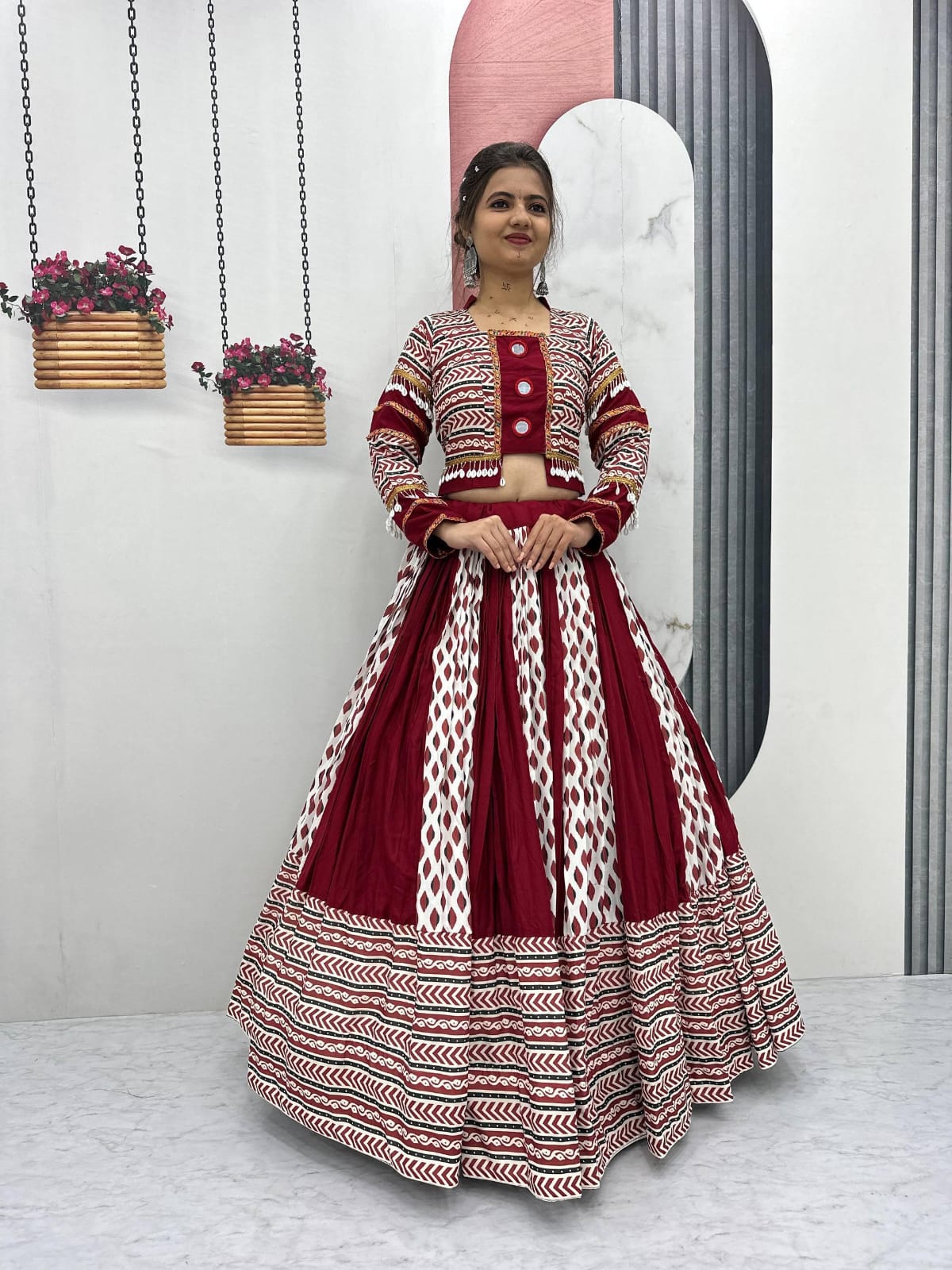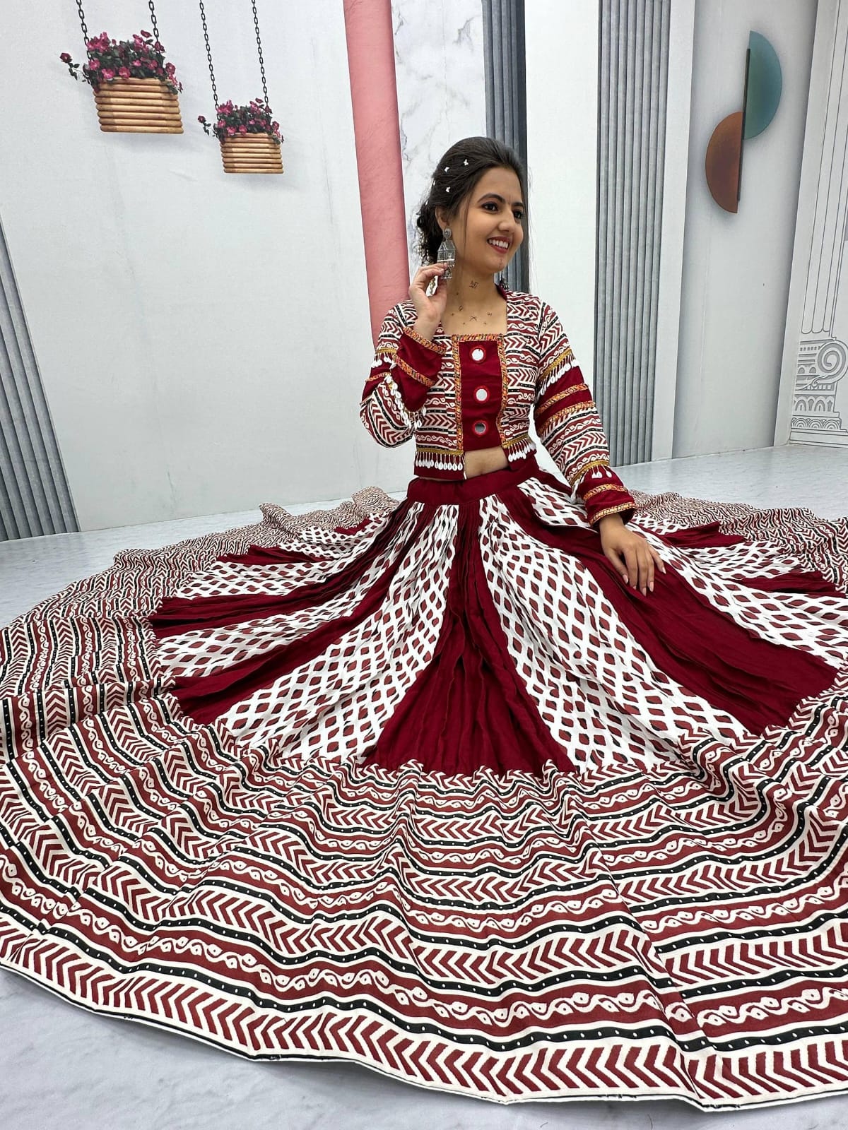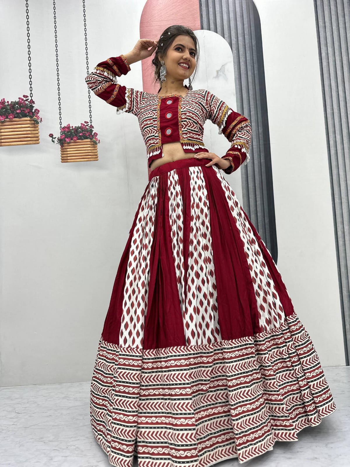 Step into the festive spirit with our Navratri Special Lehenga Choli, designed to make you shine this season. Crafted with premium Riyon Cotton for maximum comfort and style, this lehenga features a grand 6-meter flair that twirls beautifully, perfect for Garba and Dandiya nights.
