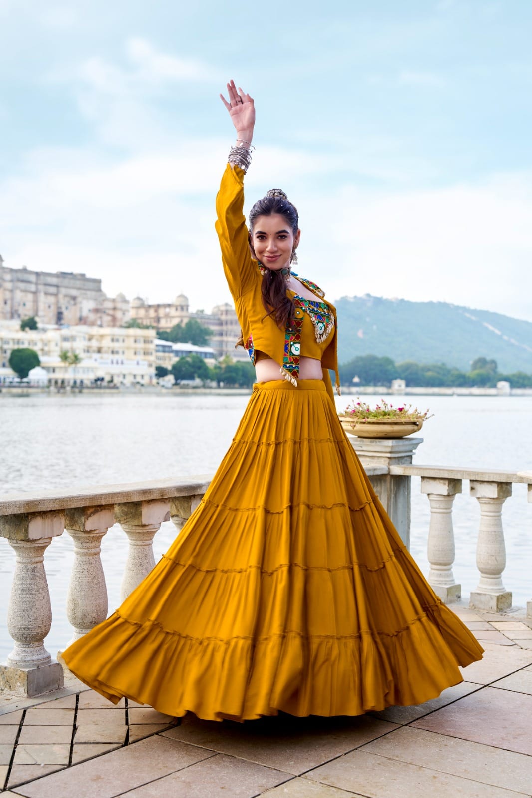 Navratri Special Pure Rayon Lehenga Set with Mirror Gamthi Work & Cowrie Lace