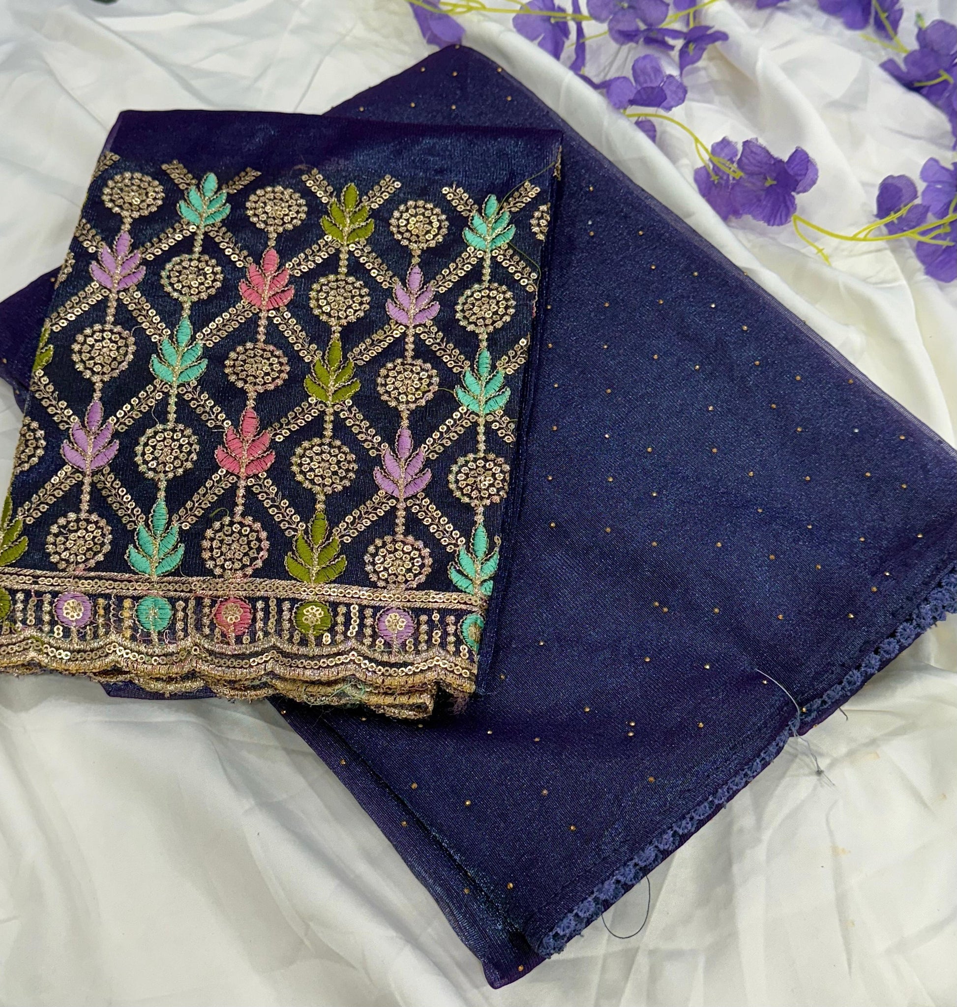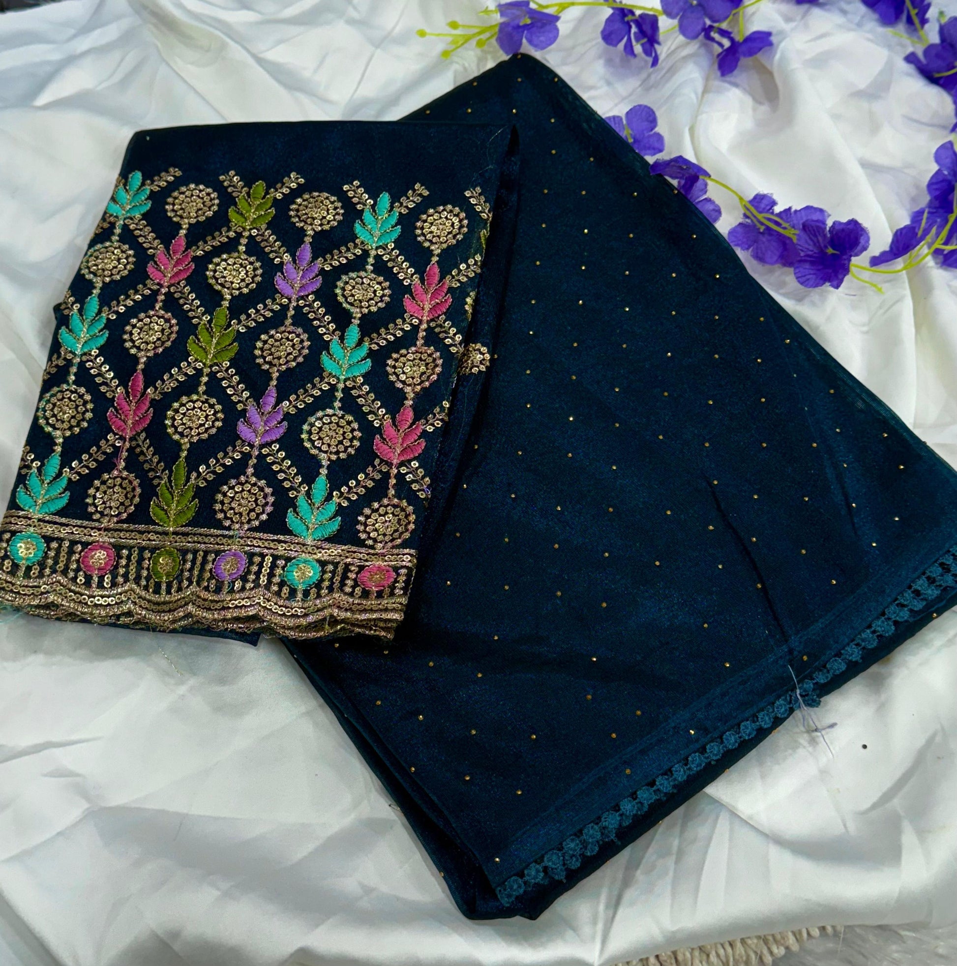 The set includes a 0.80-meter blouse piece in a matching tone-to-tone color, crafted with heavy embroidery to create a cohesive and luxurious outfit. Ideal for customized designer blouses, you can opt for sleeveless, deep-neck, or even boat-neck patterns depending on your preference.
