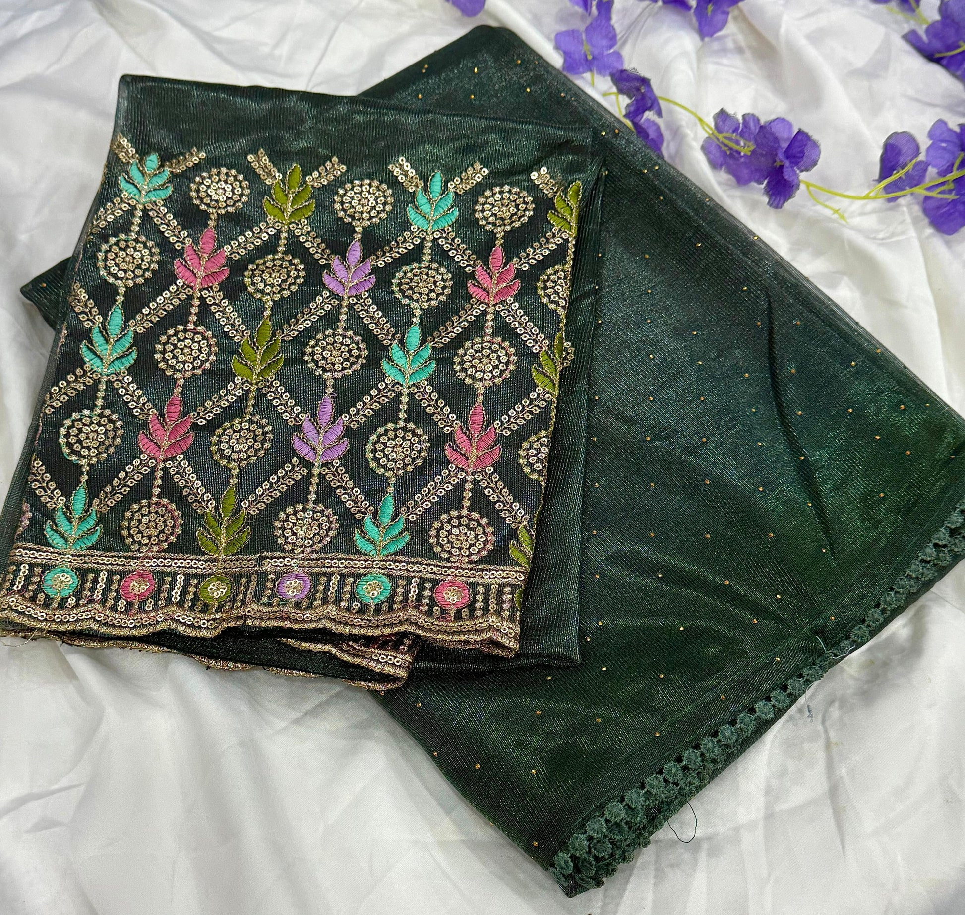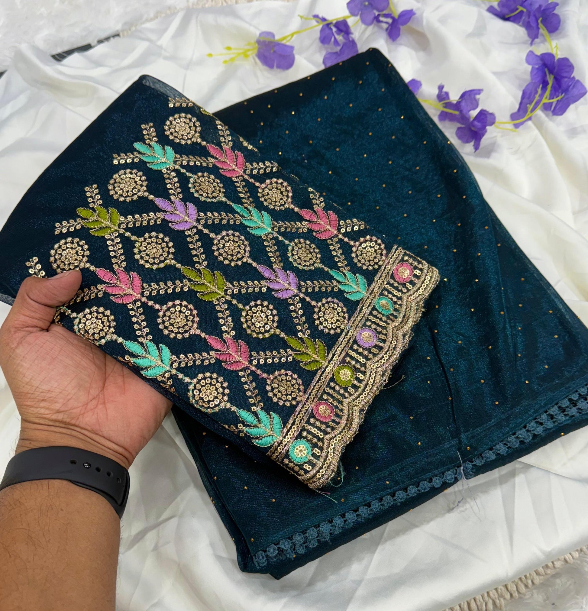 Designed with a rich tone-on-tone border, the saree features elegant embroidery that complements the fabric shade — adding depth, dimension, and refinement to the overall design.