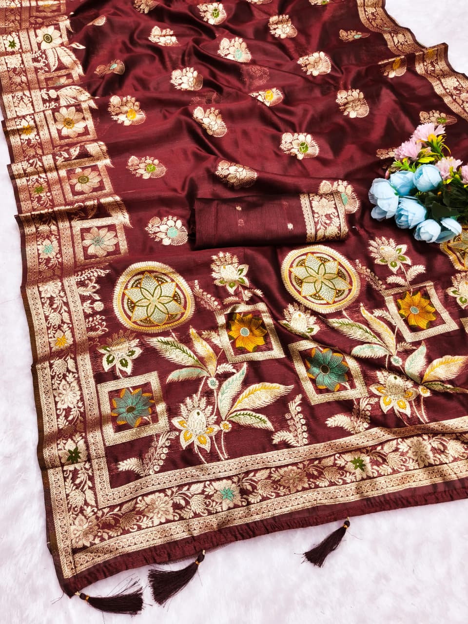Step into sophistication with our exquisite Organza Silk Saree, a true blend of luxury and artistry. Crafted with care and designed for the modern woman who values tradition with a touch of contemporary flair, this saree is a perfect choice for weddings, festive occasions, and special gatherings.