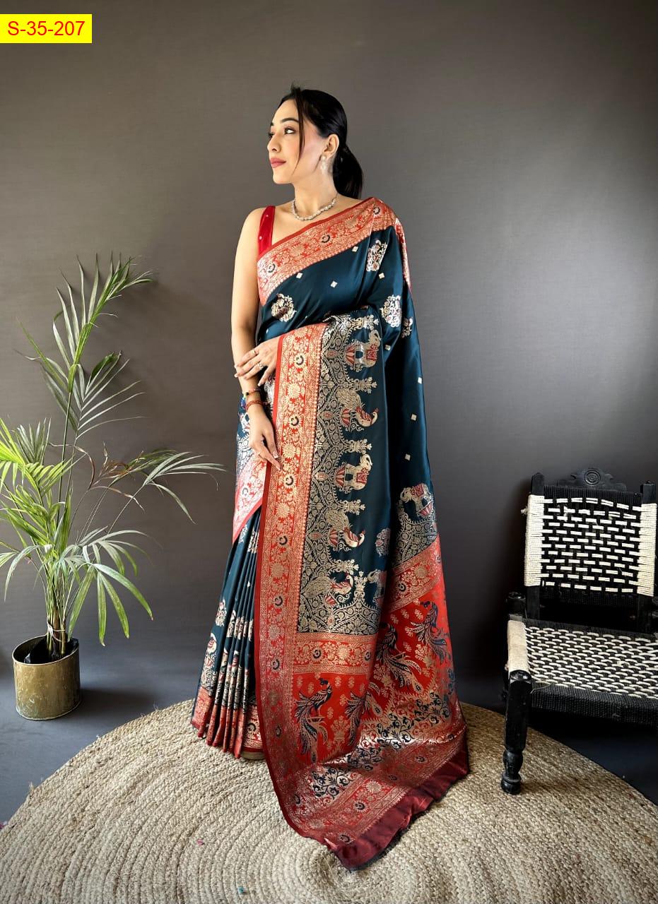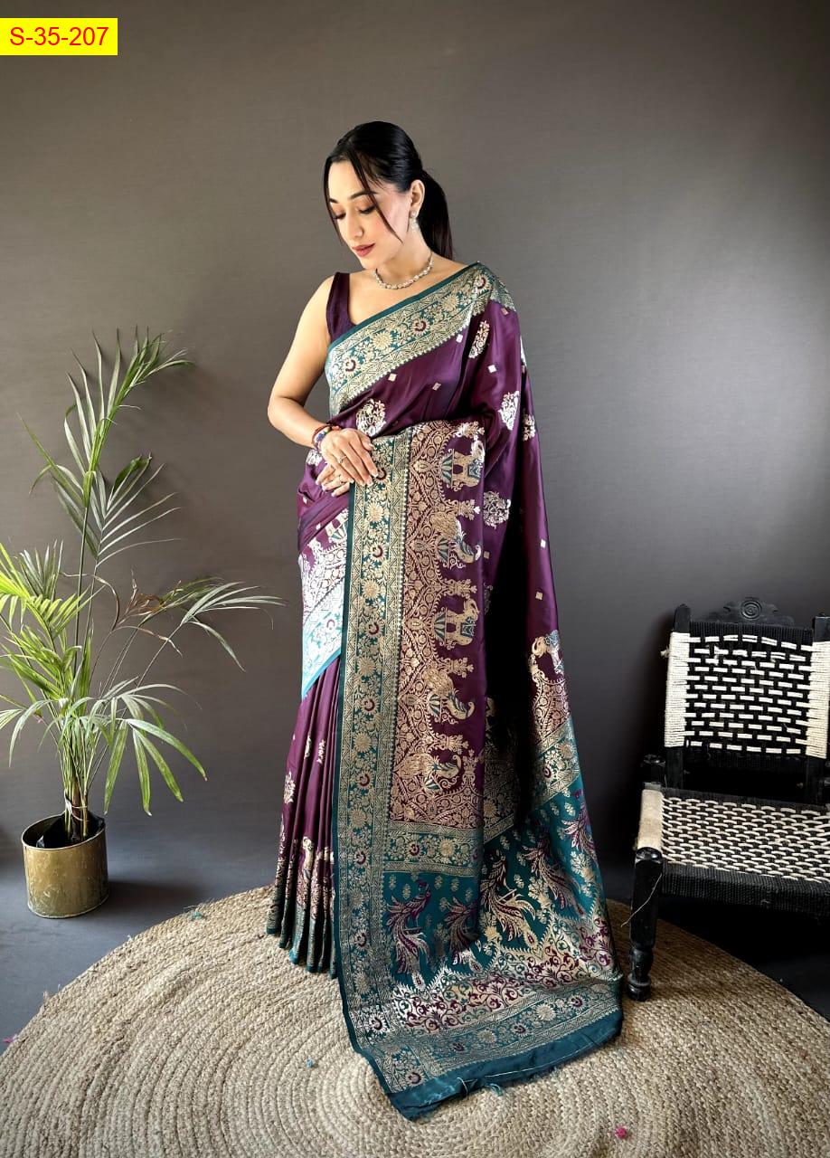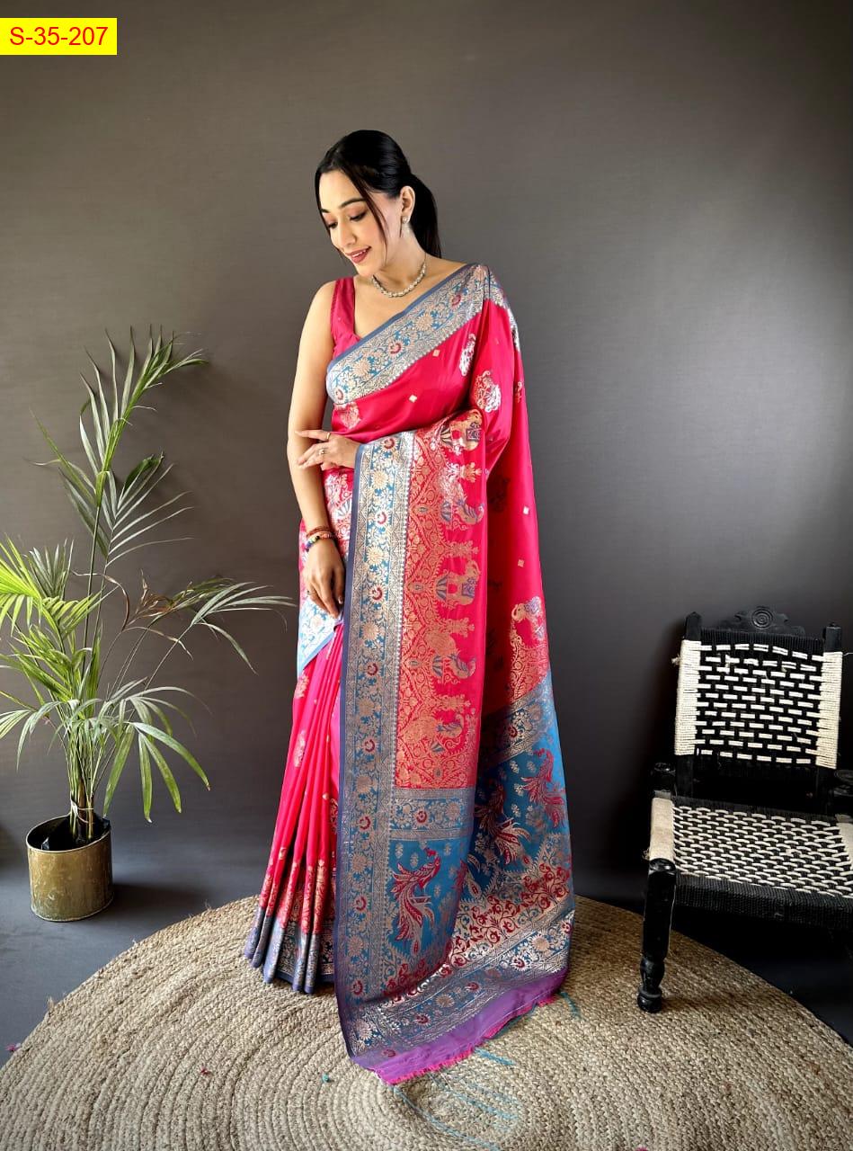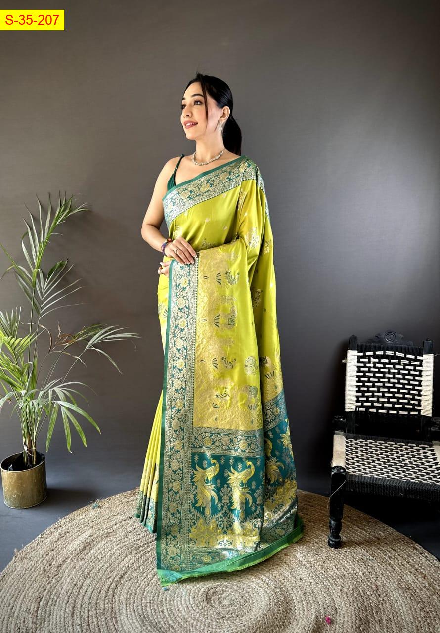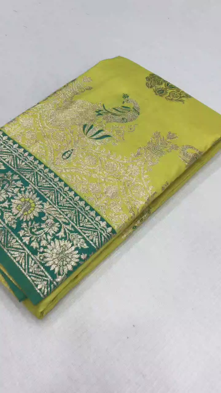 🌻With golden zari weaving meenakari peacock design all over the saree