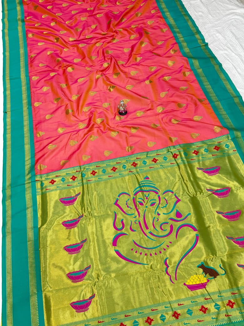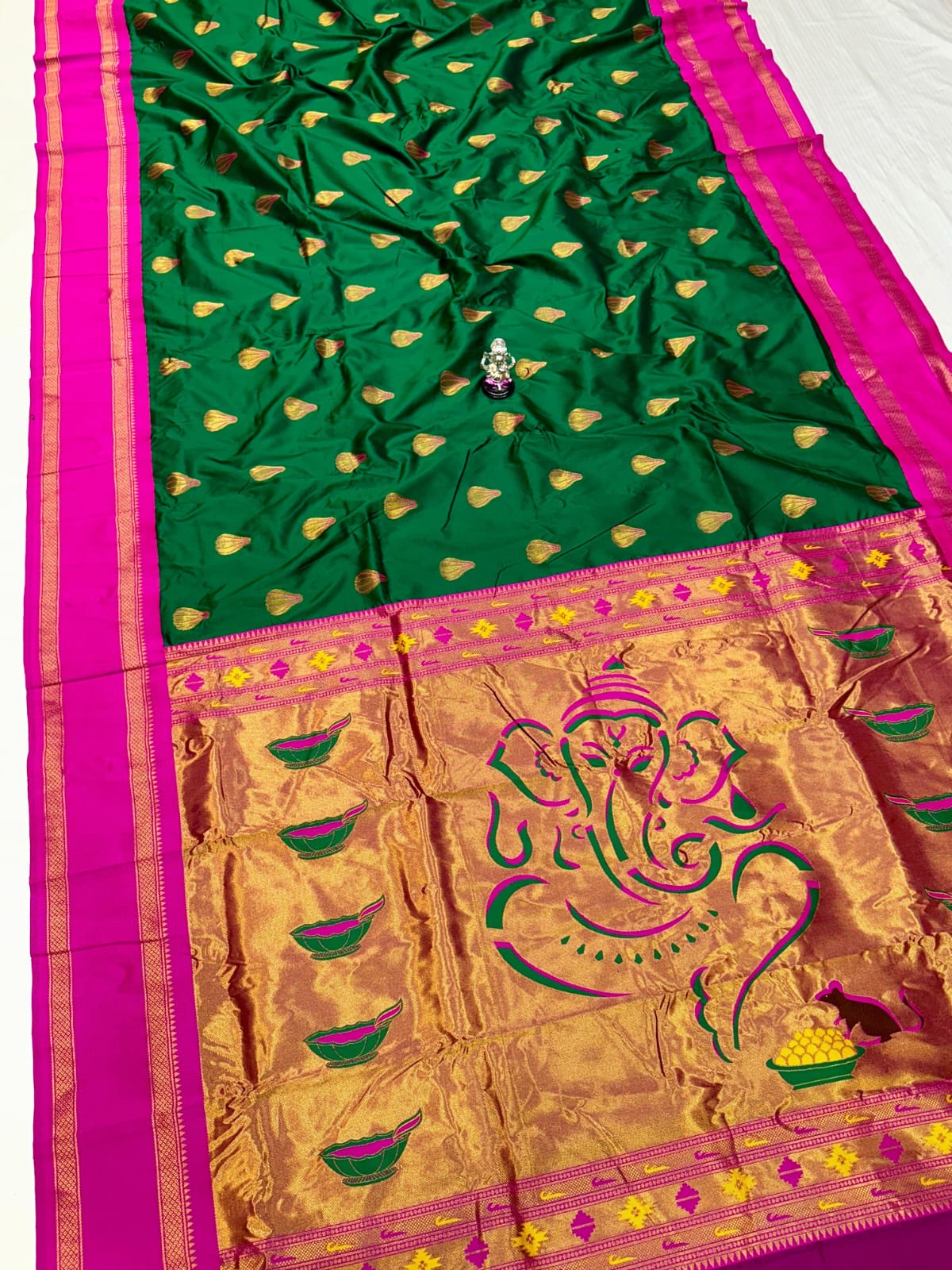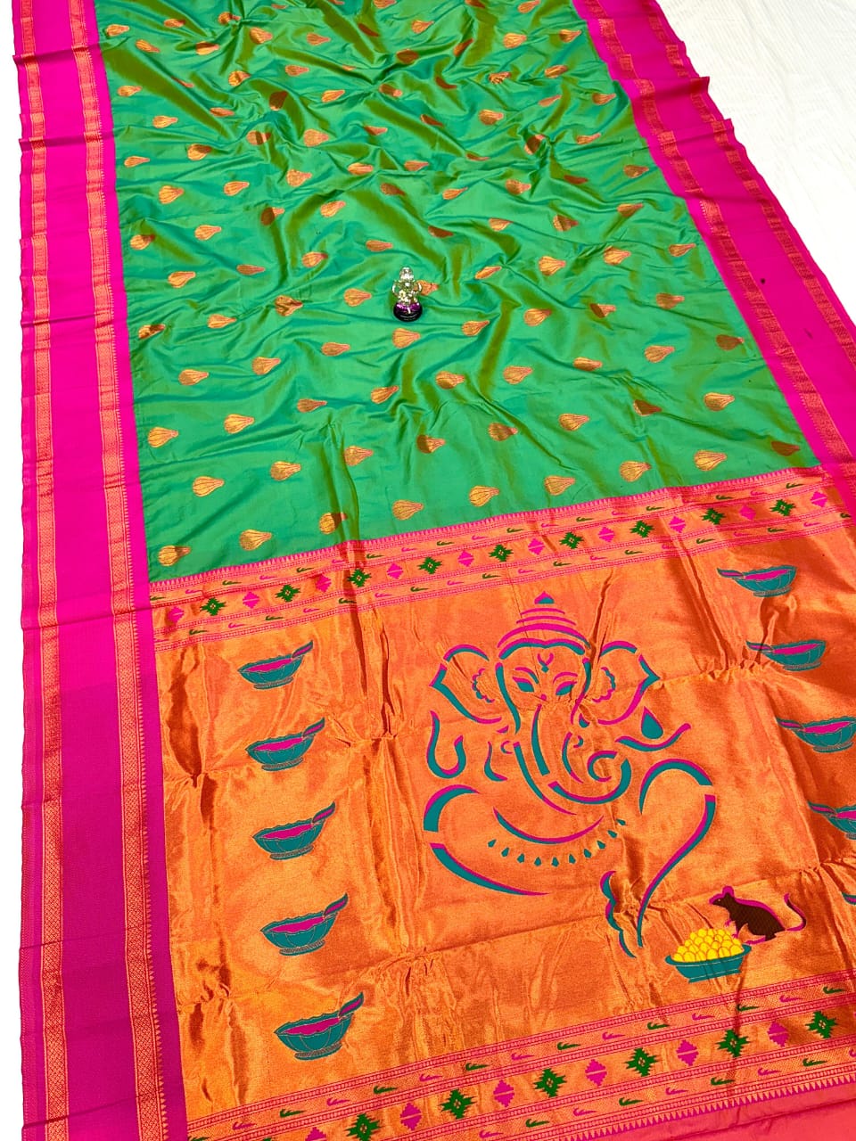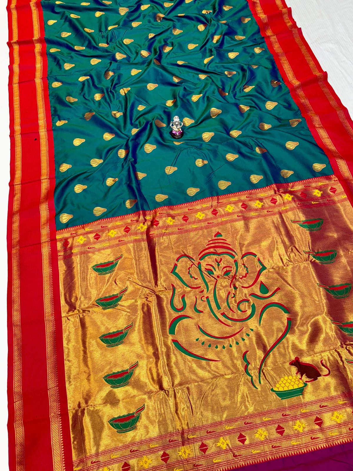 Celebrate tradition with devotion and style in our Shri Modak Ganesha Paithani Saree. Inspired by the blessings of Lord Ganesha and the cultural essence of Paithani weaves, this saree is a true masterpiece that symbolizes auspiciousness, grace, and heritage. Perfect for festive occasions, weddings, and religious celebrations, it brings together spirituality and fashion in the most beautiful way.