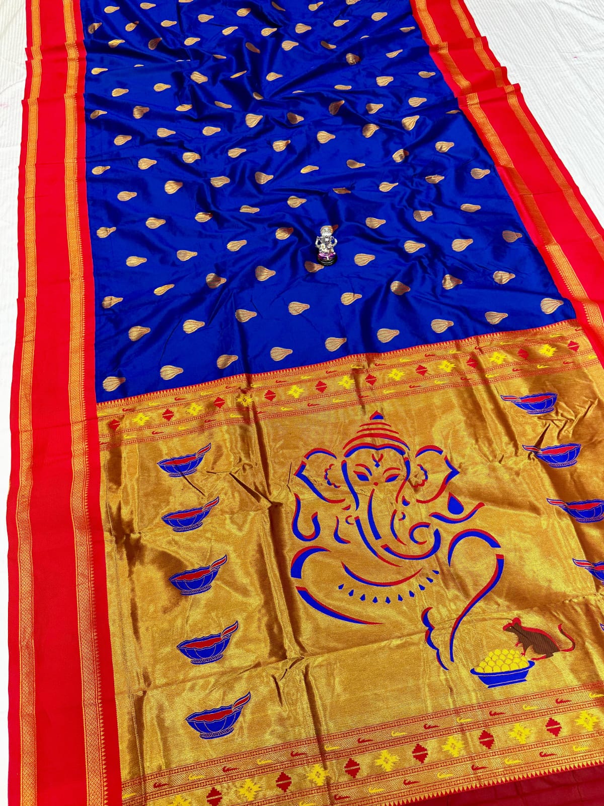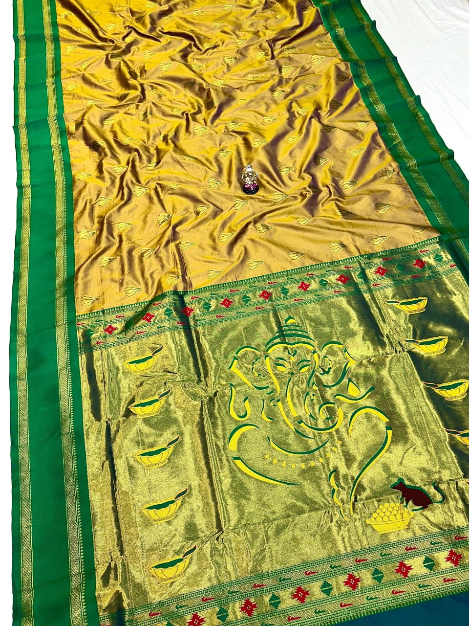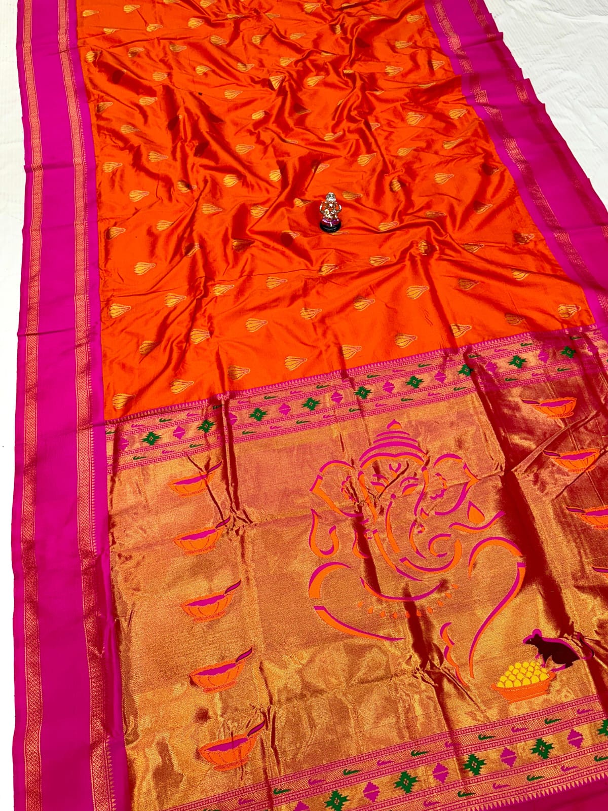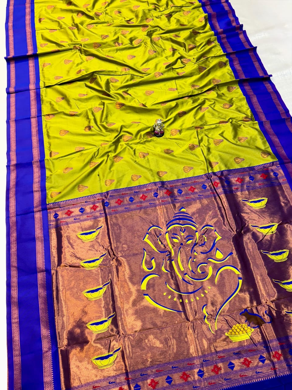 Celebrate tradition with devotion and style in our Shri Modak Ganesha Paithani Saree. Inspired by the blessings of Lord Ganesha and the cultural essence of Paithani weaves, this saree is a true masterpiece that symbolizes auspiciousness, grace, and heritage. Perfect for festive occasions, weddings, and religious celebrations, it brings together spirituality and fashion in the most beautiful way.