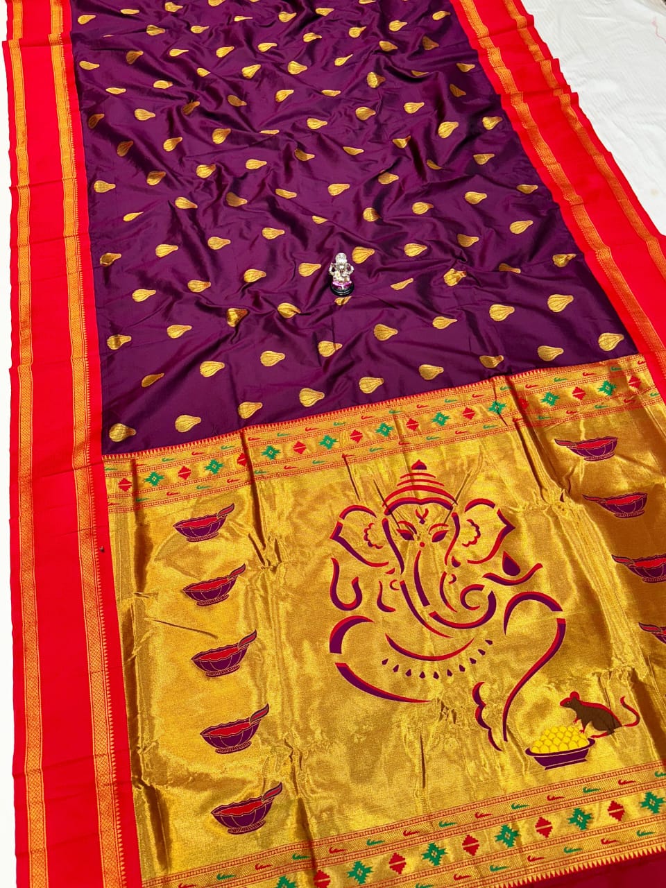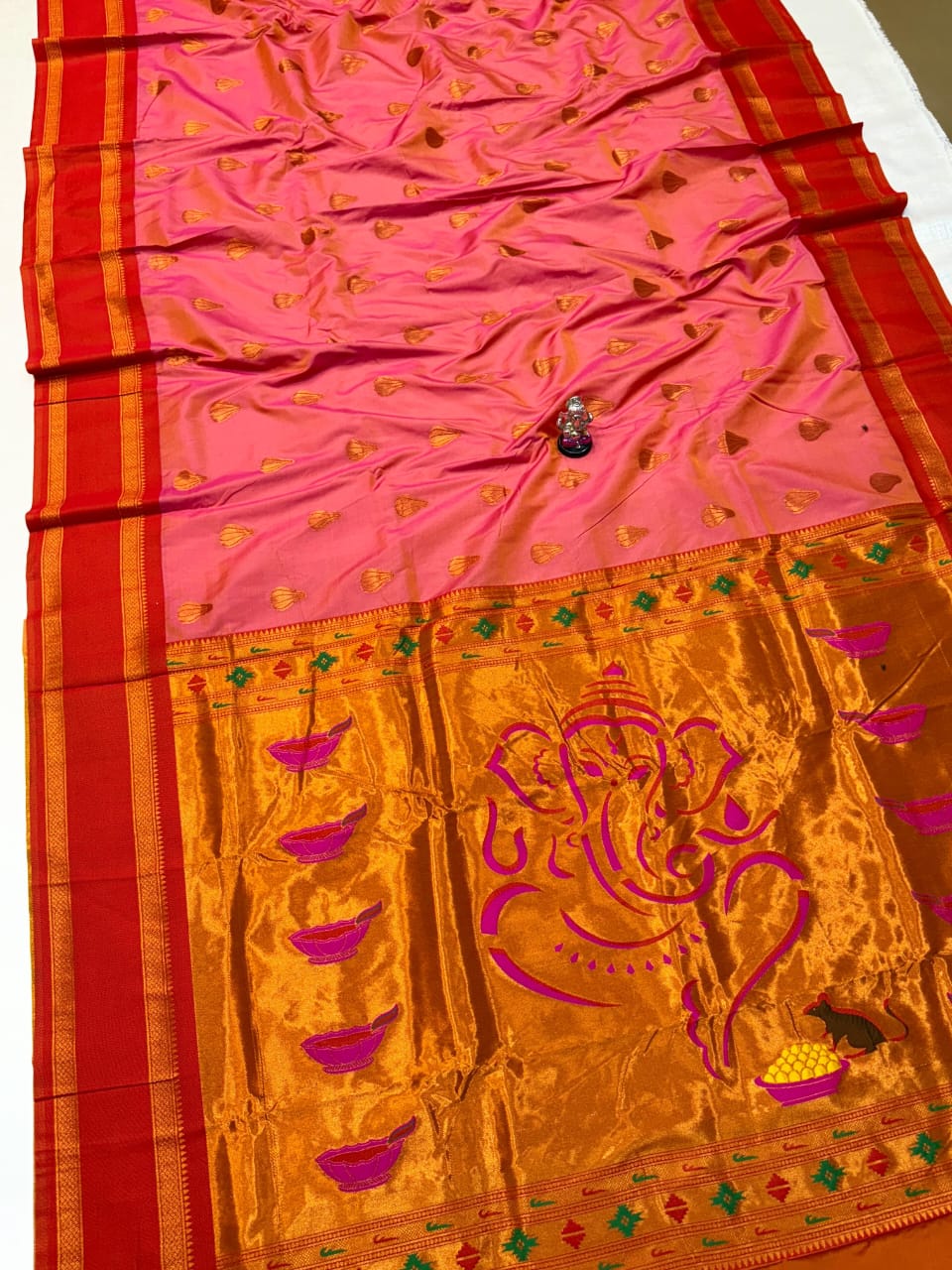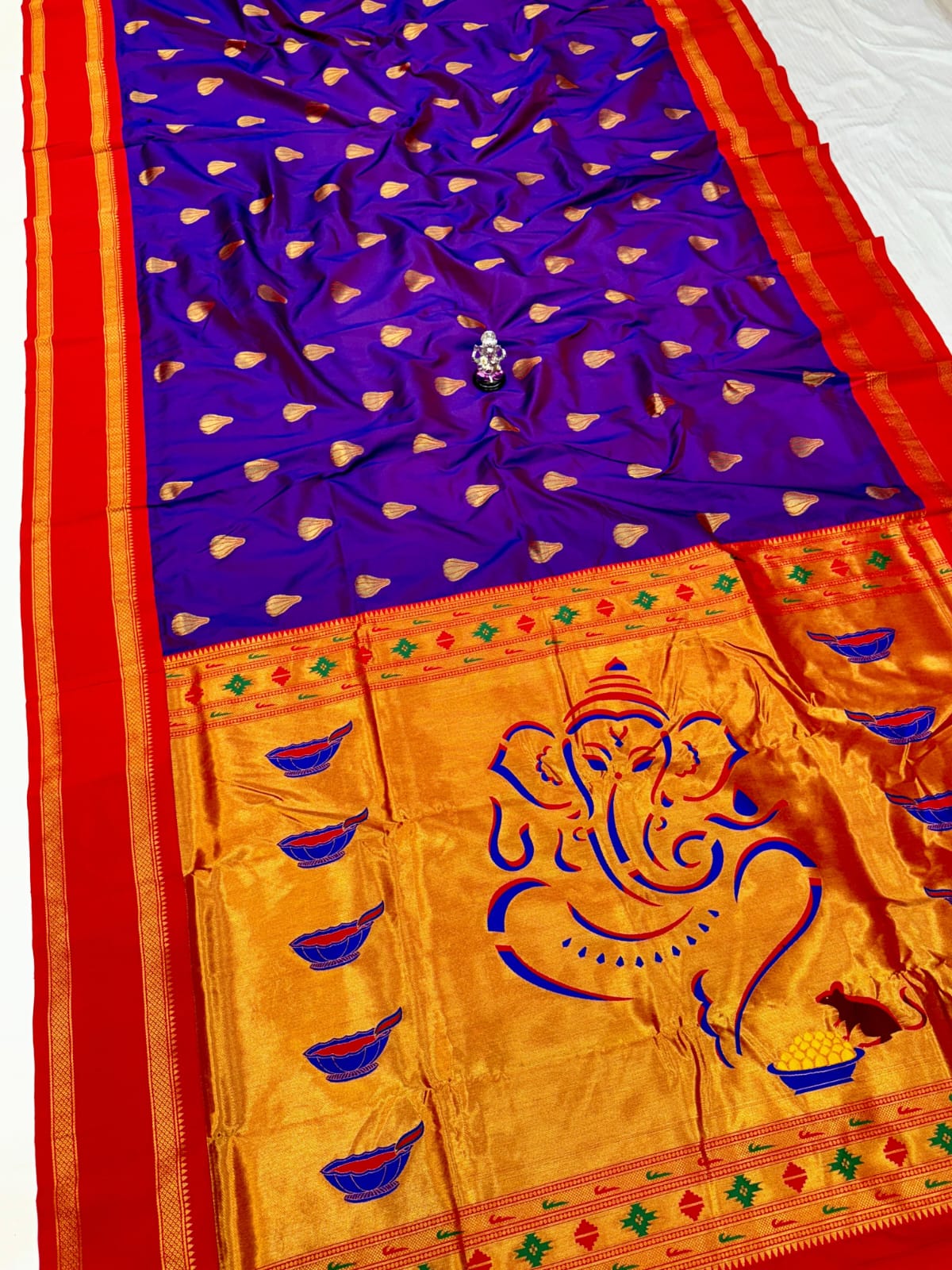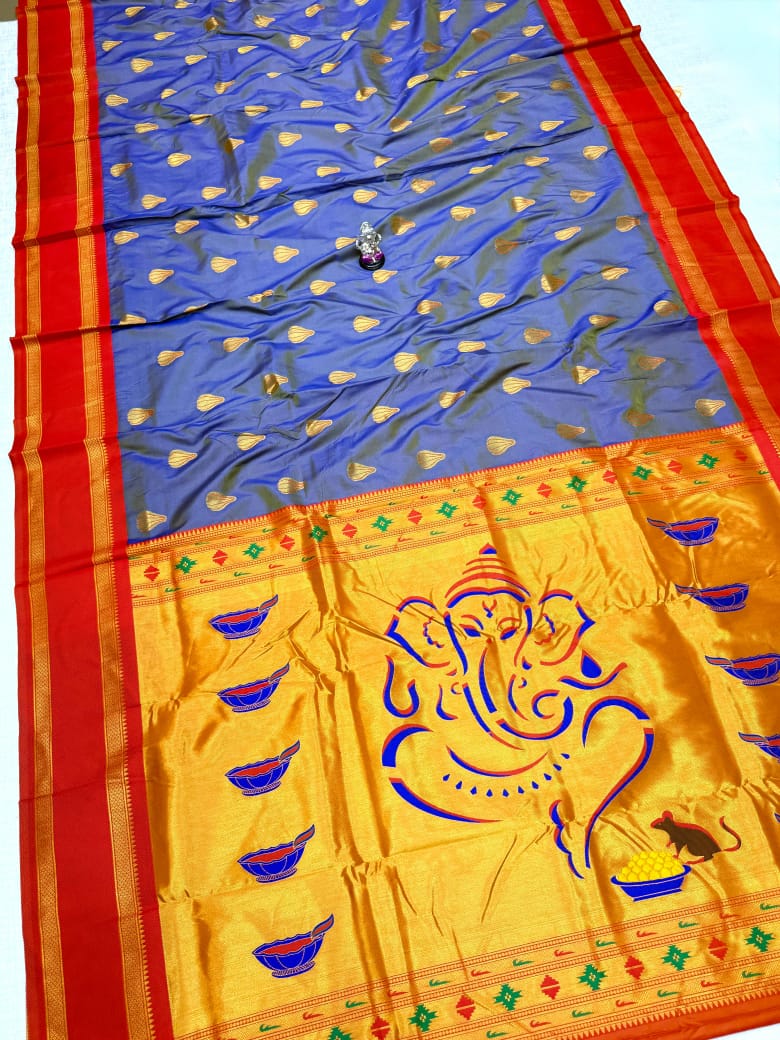 Celebrate tradition with devotion and style in our Shri Modak Ganesha Paithani Saree. Inspired by the blessings of Lord Ganesha and the cultural essence of Paithani weaves, this saree is a true masterpiece that symbolizes auspiciousness, grace, and heritage. Perfect for festive occasions, weddings, and religious celebrations, it brings together spirituality and fashion in the most beautiful way.