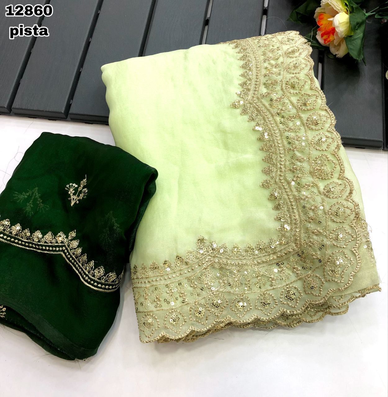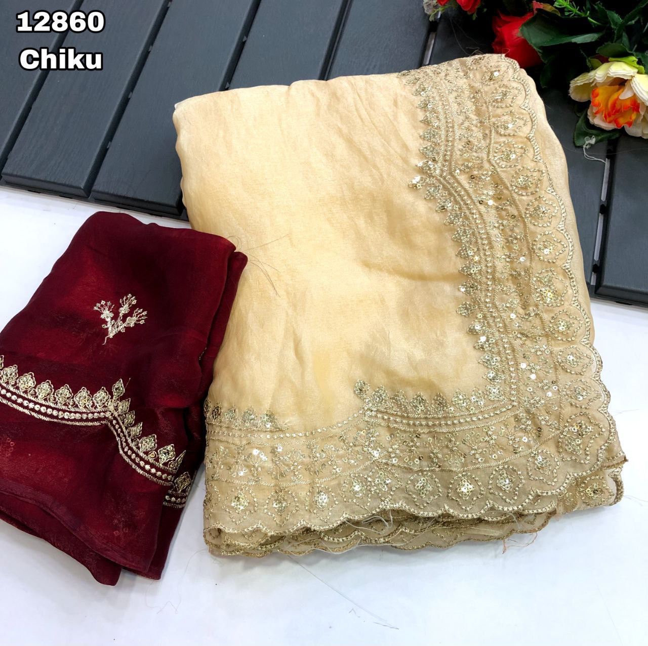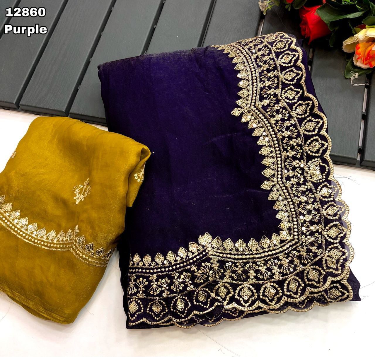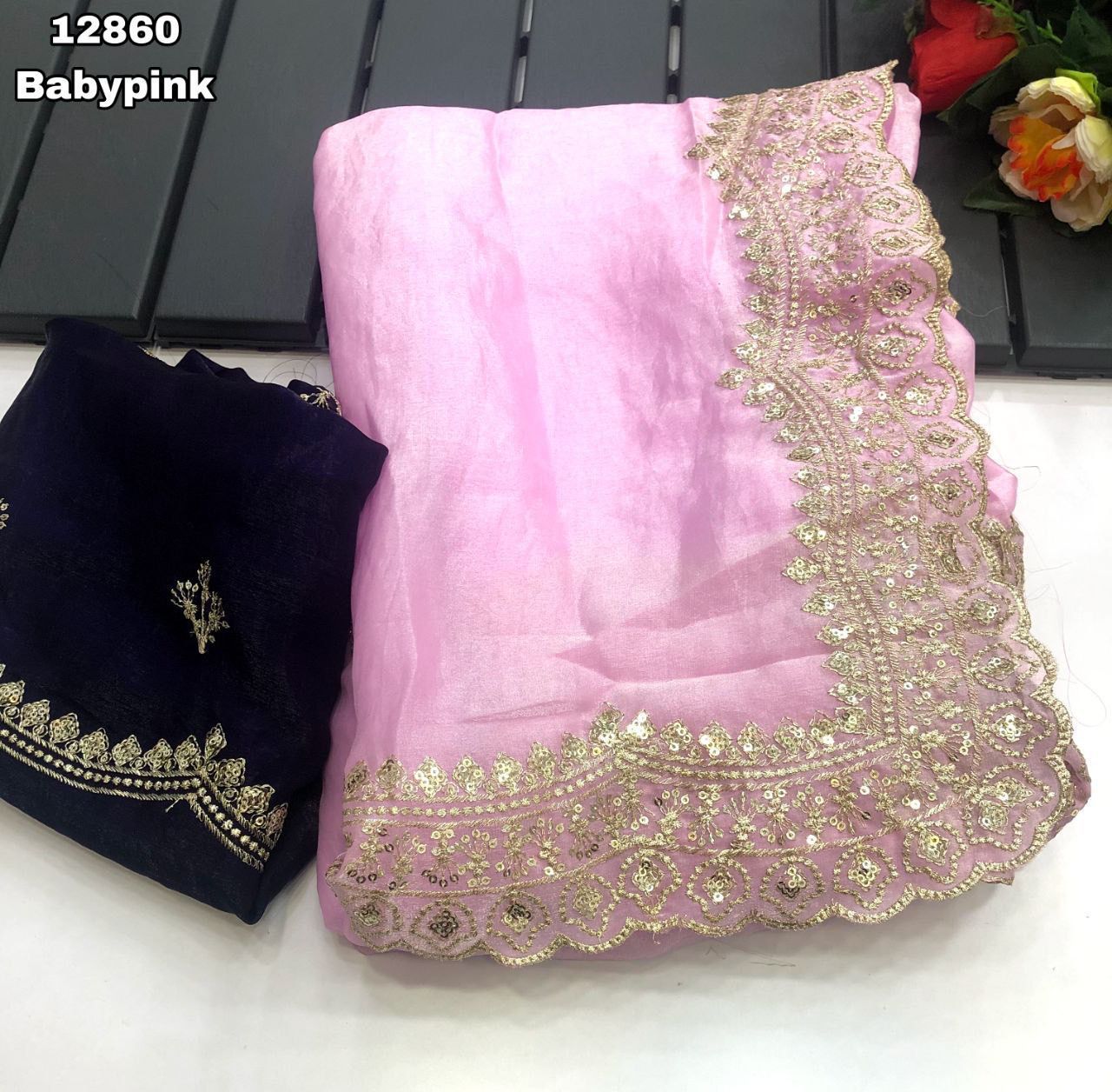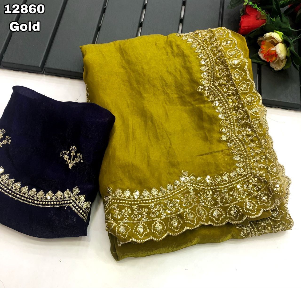 Fabric - Soft & smooth space silk fendy satin with gold zari embroidery & sequence work with scalloped border