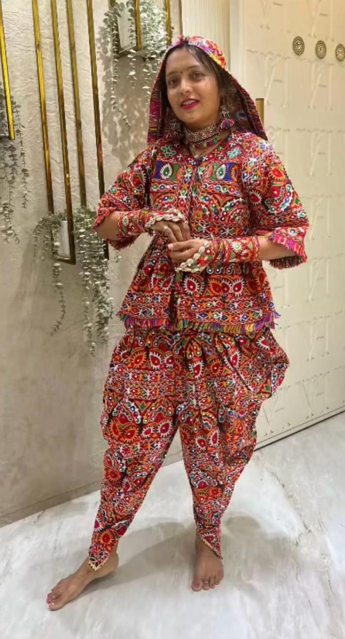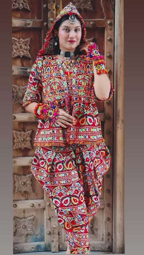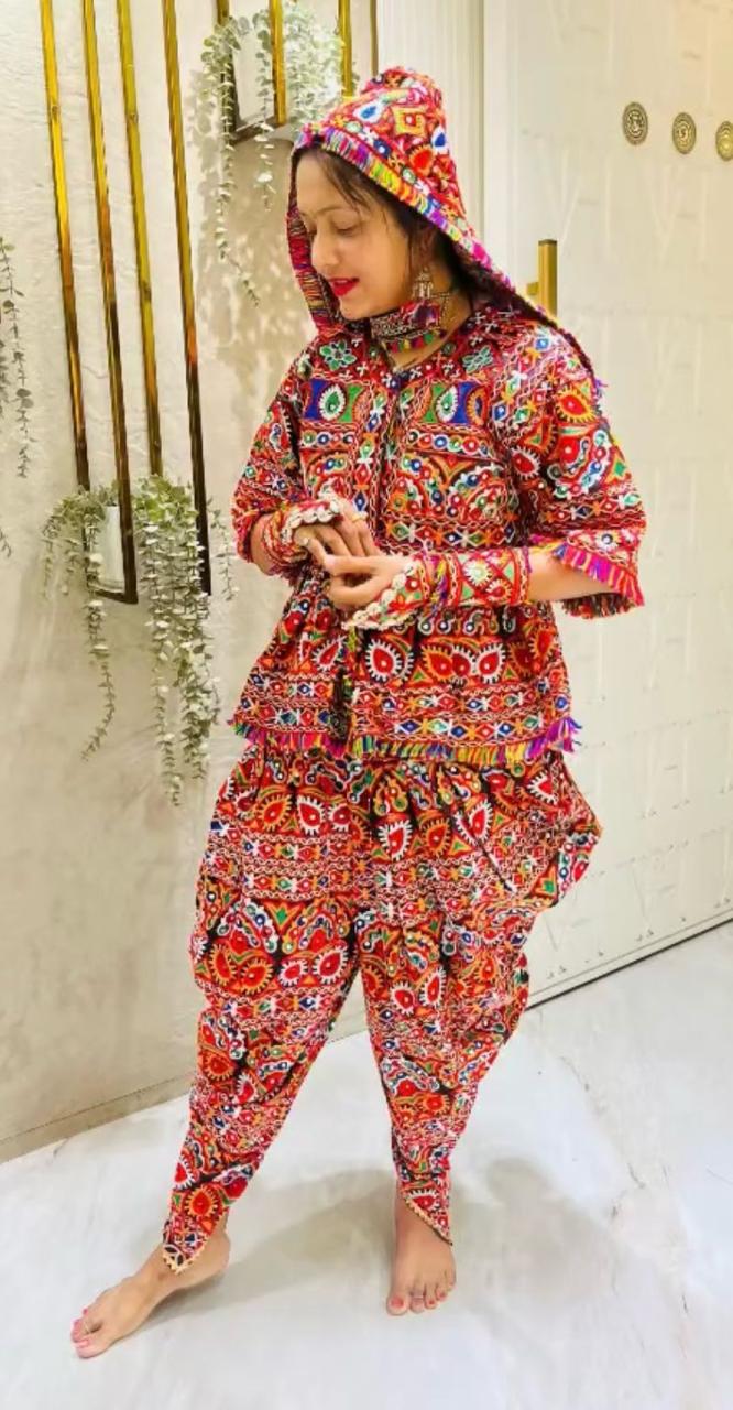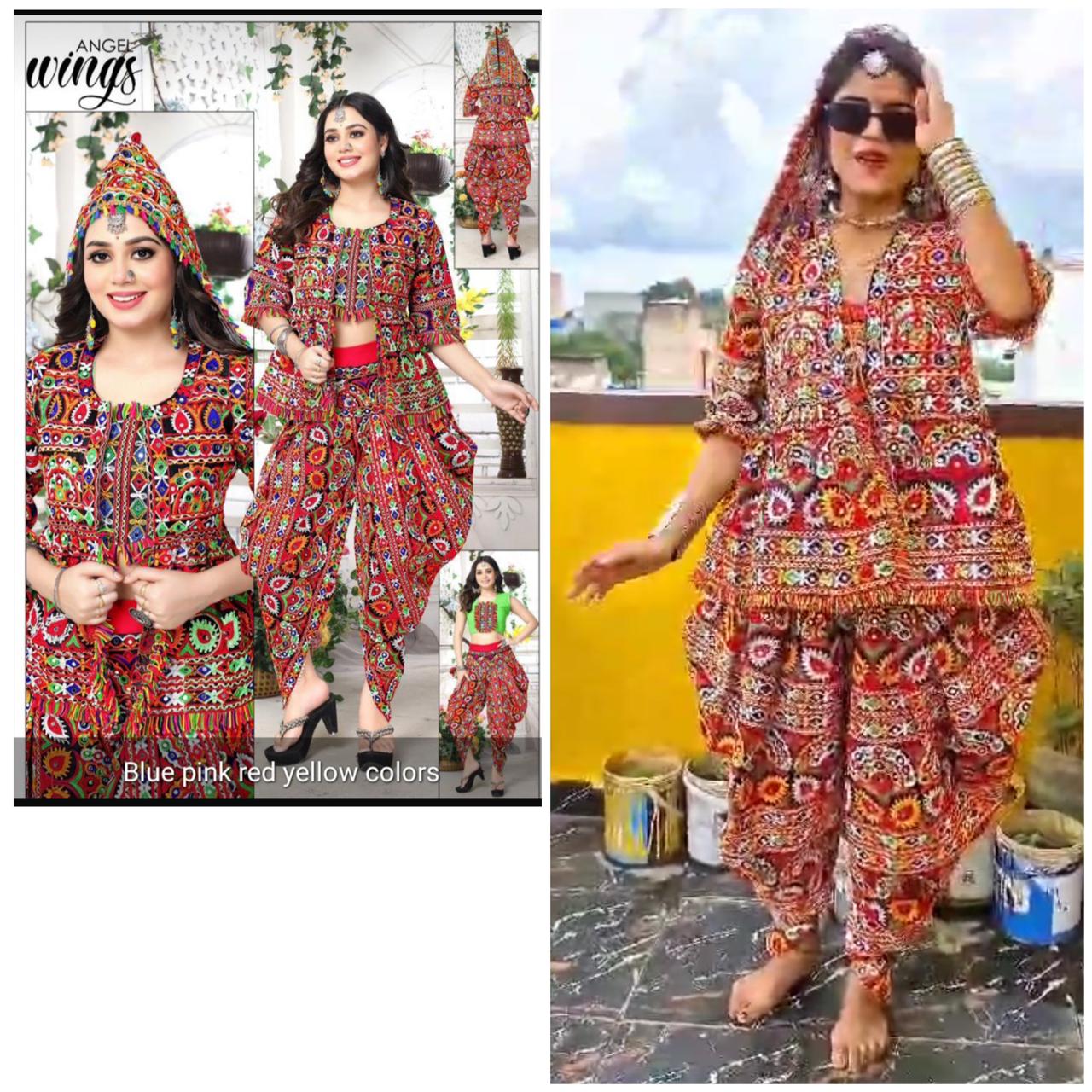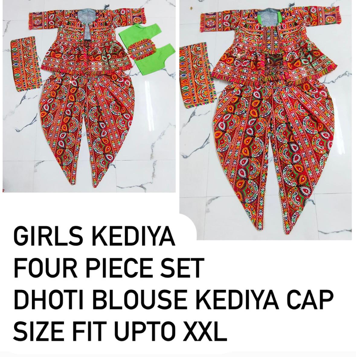 A traditional and festive 4-piece set for girls, featuring a heavy embroidered Kediya (tunic-style top), paired with a matching Dhoti, a beautifully designed blouse, and a traditional cap. This vibrant ensemble is perfect for Garba, Navratri, cultural events, or ethnic celebrations, showcasing intricate detailing and authentic Gujarati craftsmanship.
