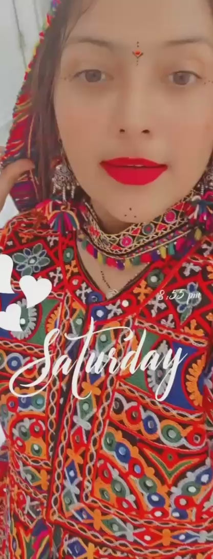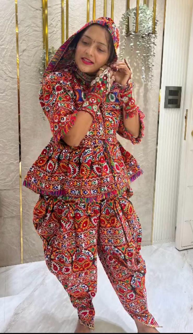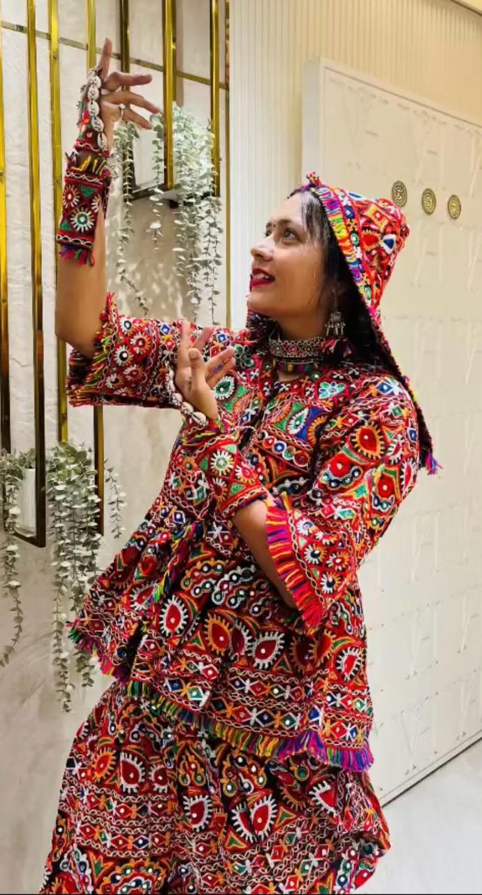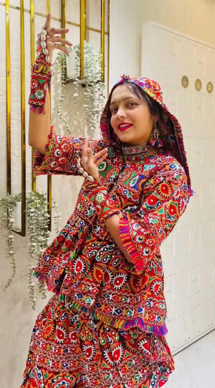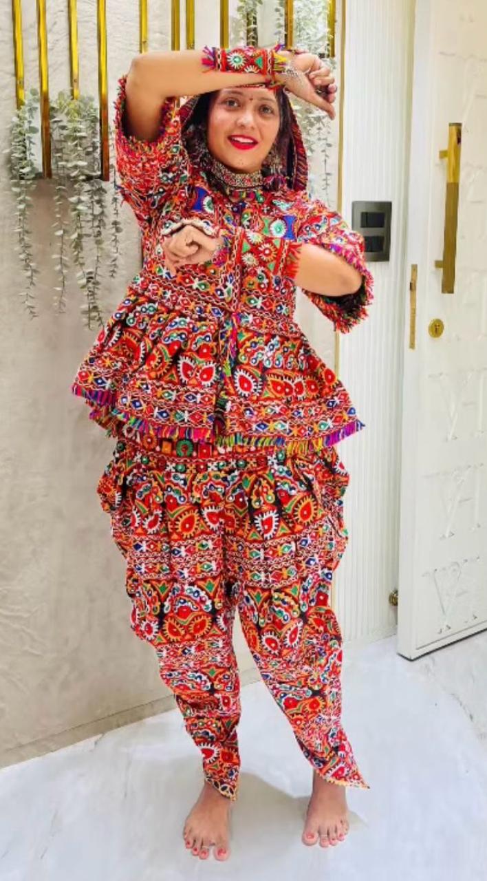 A traditional and festive 4-piece set for girls, featuring a heavy embroidered Kediya (tunic-style top), paired with a matching Dhoti, a beautifully designed blouse, and a traditional cap. This vibrant ensemble is perfect for Garba, Navratri, cultural events, or ethnic celebrations, showcasing intricate detailing and authentic Gujarati craftsmanship.